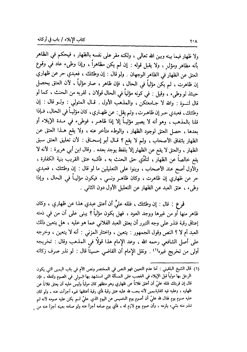 ولا ظهار فيما بينه وبين الله تعالى، ولكنه مقر على نفسه بالظهار، فيحكم في الظاهر بأنه مظاهر ومؤل، ولا يقبل قوله: إن لم يكن مظاهرا، وإذا وطئ عاد في وقوع العتق عن الظهار في الظاهر الوجهان. ولو قال: إن وطئتك، فعبدي حر عن ظهاري إن ظاهرت، لم يكن مؤليا في الحال، فإن ظاهر، صار مؤليا، لان العتق يحصل حينئذ لو وطئ. وقيل: في كونه مؤليا في الحال قولان، لقربه من الحنث، كما لو قال لنسوة: والله لا جامعتكن، والمذهب الاول. قال المتولي: ولو قال: إن وطئتك، فعبدي حر إن ظاهرت، ولم يقل: عن ظهاري، كان مؤليا في الحال، فإذا قلنا بالمذهب، وهو أنه لا يصير مؤليا إلا إذا ظاهر، فوطئ في مدة الايلاء أو بعدها، حصل العتق لوجود الظهار، والوطئ متأخر عنه، ولا يقع هذا العتق عن الظهار باتفاق الاصحاب، ولم لا يقع ؟ قال أبو إسحق: لان تعليق العتق سبق الظهار، والعتق لا يقع عن الظهار إلا بلفظ يوجد بعده. وقال ابن أبي هريرة: لانه لا يقع خالصا عن الظهار، لتأدي حق الحنث به، فأشبه عتق القريب بنية الكفارة، والاول أصح عند الاصحاب، وبنوا على التعليلين ما لو قال: إن وطئتك، فعبدي حر عن ظهاري إن ظاهرت، وكان ظاهر ونسي، فيكون مؤليا في الحال، وإذا وطئ، عتق العبد عن الظهار على التعليل الاول دون الثاني. فرع قال: إن وطئتك، فلله علي أن أعتق عبدي هذا عن ظهاري، وكان ظاهر منها أو من غيرها ووجد العود، فهل يكون مؤليا ؟ يبنى على أن من في ذمته إعتاق رقبة فنذر على وجه التبرر أن يعتق العبد الفلاني عما هو عليه، هل يتعين ذلك العبد أم لا ؟ النص وقول الجمهور: يتعين، واختار المزني: أنه لا يتعين، وخرجه على أصل الشافعي رحمه الله، وعد الامام هذا قولا في المذهب وقال: تخريجه أولى من تخريج غيره. ونقل الامام أن القاضي حسينا قال: لو نذر صرف زكاته
