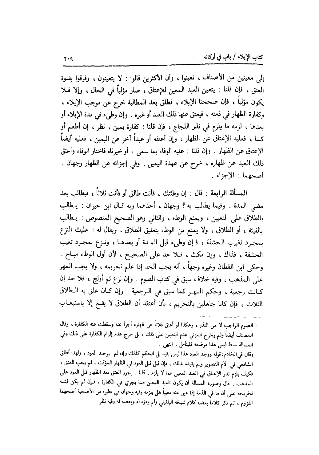إلى معينين من الاصناف، تعينوا، وأن الاكثرين قالوا: لا يتعينون، وفرقوا بقوة العتق، فإن قلنا: يتعين العبد المعين للاعتاق، صار مؤليا في الحال، وإلا فلا يكون مؤليا، فإن صححنا الايلاء، فطلق بعد المطالبة خرج عن موجب الايلاء، وكفارة الظهار في ذمته، فيعتق عنها ذلك العبد أو غيره. وإن وطئ في مدة الايلاء أو بعدها، لزمه ما يلزم في نذر اللجاج، فإن قلنا: كفارة يمين، نظر، إن أطعم أو كسا، فعليه الاعتاق عن الظهار، وإن أعتقه أو عبدا اخر عن اليمين، فعليه أيضا الاعتاق عن الظهار. وإن قلنا: عليه الوفاء بما سمى، أو خيرناه فاختار الوفاء وأعتق ذلك العبد عن ظهاره، خرج عن عهدة اليمين. وفي إجزائه عن الظهار وجهان. أصحهما: الاجزاء. المسألة الرابعة: قال: إن وطئتك، فأنت طالق أو فأنت ثلاثا، فيطالب بعد مضي المدة. وفيما يطالب به ؟ وجهان، أحدهما وبه قال ابن خيران: يطالب بالطلاق على التعيين، ويمنع الوطئ، والثاني وهو الصحيح المنصوص: يطالب بالفيئة، أو الطلاق، ولا يمنع من الوطئ بتعليق الطلاق، ويقال له: عليك النزع بمجرد تغييب الحشفة، فإن وطئ قبل المدة أو بعدها، ونزع بمجرد تغيب الحشفة، فذاك، وإن مكث، فلا حد على الصحيح، لان أول الوطئ مباح. وحكى ابن القطان وغيره وجها، أنه يجب الحد إذا علم تحريمه، ولا يجب المهر على المذهب، وفيه خلاف سبق في كتاب الصوم. وإن نزع ثم أولج، فلا حد إن كانت رجعية، وحكم المهر كما سبق في الرجعية. وإن كان علق به الطلاق الثلاث، فإن كانا جاهلين بالتحريم، بأن اعتقد أن الطلاق لا يقع إلا باستيعاب
