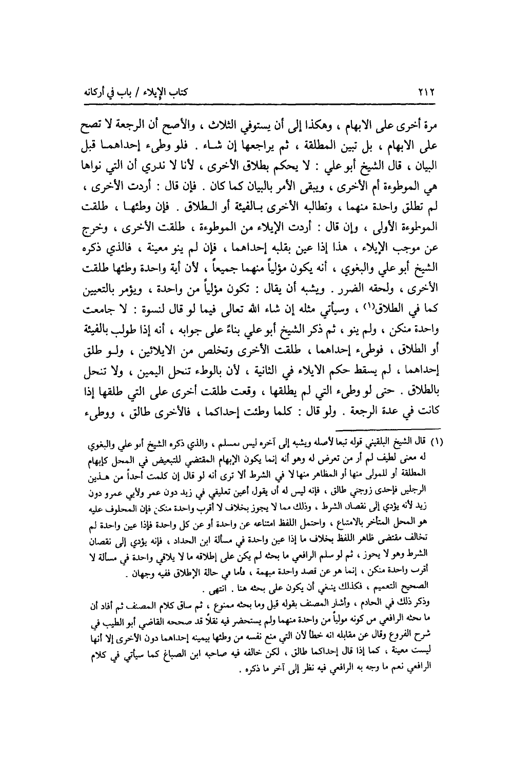 مرة أخرى على الابهام، وهكذا إلى أن يستوفي الثلاث، والاصح أن الرجعة لا تصح على الابهام، بل تبين المطلقة، ثم يراجعها إن شاء. فلو وطئ إحداهما قبل البيان، قال الشيخ أبو علي: لا يحكم بطلاق الاخرى، لانا لا ندري أن التي نواها هي الموطوءة أم الاخرى، ويبقى الامر بالبيان كما كان. فإن قال: أردت الاخرى، لم تطلق واحدة منهما، وتطالبه الاخرى بالفيأة أو الطلاق. فإن وطئها، طلقت الموطوءة الاولى، وإن قال: أردت الايلاء من الموطوءة، طلقت الاخرى، وخرج عن موجب الايلاء، هذا إذا عين بقلبه إحداهما، فإن لم ينو معينة، فالذي ذكره الشيخ أبو علي والبغوي، أنه يكون مؤليا منهما جميعا، لان أية واحدة وطئها طلقت الاخرى، ولحقه الضرر. ويشبه أن يقال: تكون مؤليا من واحدة، ويؤمر بالتعيين. كما في الطلاق، وسيأتي مثله إن شاء الله تعالى فيما لو قال لنسوة: لا جامعت واحدة منكن، ولم ينو، ثم ذكر الشيخ أبو علي بناء على جوابه، أنه إذا طولب بالفيأة أو الطلاق، فوطئ إحداهما، طلقت الاخرى وتخلص من الايلائين، ولو طلق إحداهما، لم يسقط حكم الايلاء في الثانية، لان بالوطئ تنحل اليمين، ولا تنحل بالطلاق. حتى لو وطئ التي لم يطلقها، وقعت طلقة أخرى على التي طلقها إذا كانت في عدة الرجعة. ولو قال: كلما وطئت إحداكما، فالاخرى طالق، ووطئ