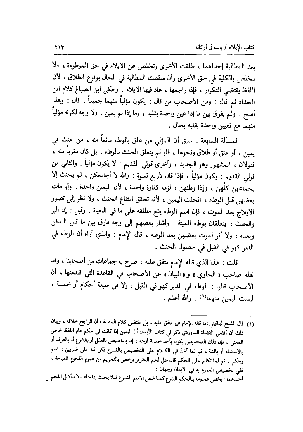 بعد المطالبة إحداهما، طلقت الاخرى وتخلص عن الايلاء في حق الموطوءة، ولا يتخلص بالكلية في حق الاخرى وإن سقطت المطالبة في الحال بوقوع الطلاق، لان اللفظ يقتضي التكرار، فإذا راجعها، عاد فيها الايلاء. وحكى ابن الصباغ كلام ابن الحداد ثم قال: ومن الاصحاب من قال: يكون مؤليا منهما جميعا، قال: وهذا أصح. ولم يفرق بين ما إذا عين واحدة بقلبه، وما إذا لم يعين، ولا وجه لكونه مؤليا منهما مع تعيين واحدة بقلبه بحال. المسألة السابعة: سبق أن المؤلي من علق بالوطئ مانعا منه، من حنث في يمين، أو عتق أو طلاق ونحوها، فلو لم يتعلق الحنث بالوطئ، بل كان مقربا منه، فقولان، المشهور وهو الجديد، وأخرى قولي القديم: لا يكون مؤليا. والثاني من قولي القديم: يكون مؤليا، فإذا قال لاربع نسوة: والله لا أجامعكن، لم يحنث إلا بجماعهن كلهن، وإذا وطئهن، لزمه كفارة واحدة، لان اليمين واحدة. ولو مات بعضهن قبل الوطئ، انحلت اليمين، لانه تحقق امتناع الحنث، ولا نظر إلى تصور الايلاج بعد الموت، فإن اسم الوطئ يقع مطلقة على ما في الحياة. وقيل: إن البر والحنث، يتعلقان بوطئ الميتة. وأشار بعضهم إلى وجه فارق بين ما قبل الدفن وبعده، ولا أثر لموت بعضهن بعد الوطئ، قال الامام: والذي أراه أن الوطئ في الدبر كهو في القبل في حصول الحنث. قلت: هذا الذي قاله الامام متفق عليه، صرح به جماعات من أصحابنا، وقد نقله صاحب الحاوي والبيان عن الاصحاب في القاعدة التي قدمتها، أن الاصحاب قالوا: الوطئ في الدبر كهو في القبل، إلا في سبعة أحكام أو خمسة، ليست اليمين منها. والله أعلم.
