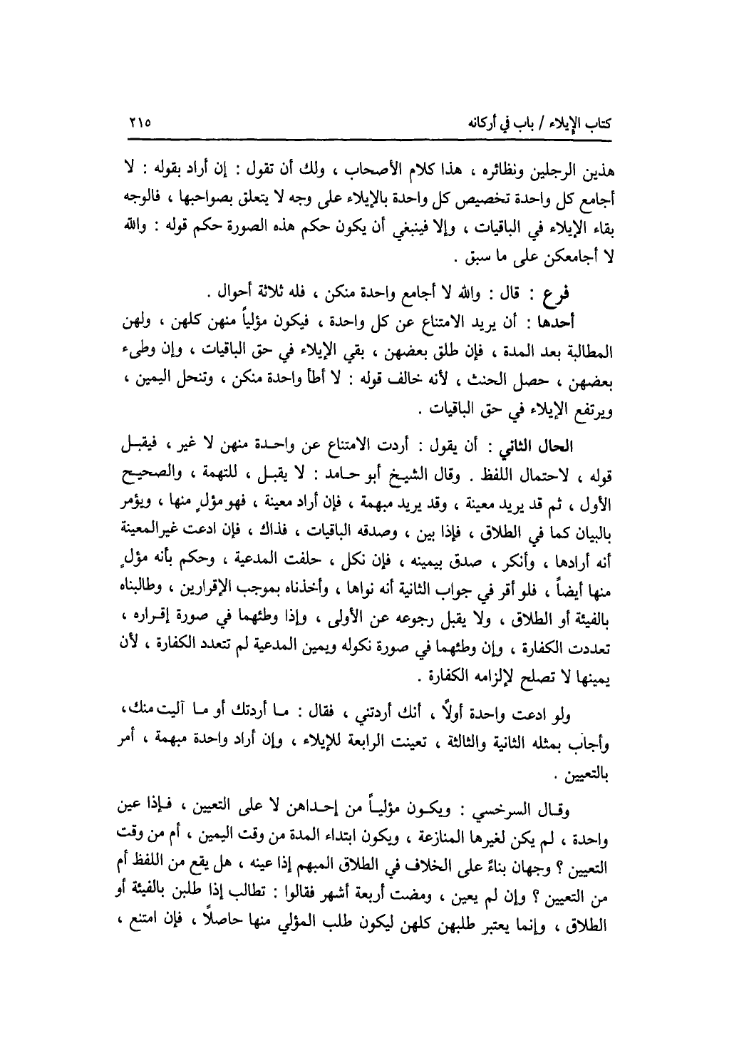 هذين الرجلين ونظائره، هذا كلام الاصحاب، ولك أن تقول: إن أراد بقوله: لا أجامع كل واحدة تخصيص كل واحدة بالايلاء على وجه لا يتعلق بصواحبها، فالوجه بقاء الايلاء في الباقيات، وإلا فينبغي أن يكون حكم هذه الصورة حكم قوله: والله لا أجامعكن على ما سبق. فرع قال: والله لا أجامع واحدة منكن، فله ثلاثة أحوال. أحدها: أن يريد الامتناع عن كل واحدة، فيكون مؤليا منهن كلهن، ولهن المطالبة بعد المدة، فإن طلق بعضهن، بقي الايلاء في حق الباقيات، وإن وطئ بعضهن، حصل الحنث، لانه خالف قوله: لا أطأ واحدة منكن، وتنحل اليمين، ويرتفع الايلاء في حق الباقيات. الحال الثاني: أن يقول: أردت الامتناع عن واحدة منهن لا غير، فيقبل قوله، لاحتمال اللفظ. وقال الشيخ أبو حامد: لا يقبل، للتهمة، والصحيح الاول، ثم قد يريد معينة، وقد يريد مبهمة، فإن أراد معينة، فهو مؤل منها، ويؤمر بالبيان كما في الطلاق، فإذا بين، وصدقه الباقيات، فذاك، فإن ادعت غير المعينة أنه أرادها، وأنكر، صدق بيمينه، فإن نكل، حلفت المدعية، وحكم بأنه مؤل منها أيضا، فلو أقر في جواب الثانية أنه نواها، وأخذناه بموجب الاقرارين، وطالبناه بالفيئة أو الطلاق، ولا يقبل رجوعه عن الاولى، وإذا وطئهما في صورة إقراره، تعددت الكفارة، وإن وطئهما في صورة نكوله ويمين المدعية لم تتعدد الكفارة، لان يمينها لا تصلح لالزامه الكفارة. ولو ادعت واحدة أولا، أنك أردتني، فقال: ما أردتك أو ما آليت منك، وأجاب بمثله الثانية والثالثة، تعينت الرابعة للايلاء، وإن أراد واحدة مبهمة، أمر بالتعيين. وقال السرخسي: ويكون مؤليا من إحداهن لا على التعيين، فإذا عين واحدة، لم يكن لغيرها المنازعة، ويكون ابتداء المدة من وقت اليمين، أم من وقت التعيين ؟ وجهان بناء على الخلاف في الطلاق المبهم إذا عينه، هل يقع من اللفظ أم من التعيين ؟ وإن لم يعين، ومضت أربعة أشهر فقالوا: تطالب إذا طلبن بالفيئة أو الطلاق، وإنما يعتبر طلبهن كلهن ليكون طلب المؤلي منها حاصلا، فإن امتنع،