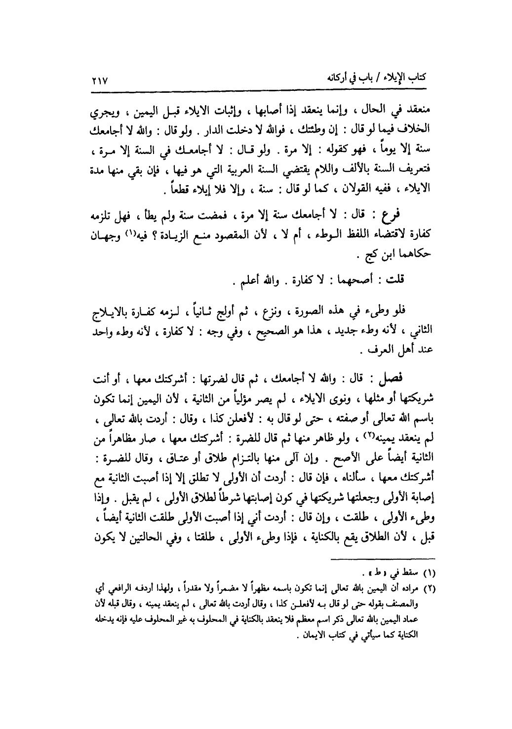 منعقد في الحال، وإنما ينعقد إذا أصابها، وإثبات الايلاء قبل اليمين ممتنع، ويجري الخلاف فيما لو قال: إن وطئتك، فوالله لا دخلت الدار. ولو قال: والله لا أجامعك سنة إلا يوما، فهو كقوله: إلا مرة. ولو قال: لا أجامعك في السنة إلا مرة، فتعريف السنة بالالف واللام يقتضي السنة العربية التي هو فيها، فإن بقي منها مدة الايلاء، ففيه القولان، كما لو قال: سنة، وإلا فلا إيلاء قطعا. فرع قال: لا أجامعك سنة إلا مرة، فمضت سنة ولم يطأ، فهل تلزمه كفارة لاقتضاء اللفظ الوطئ، أم لا، لان المقصود منع الزيادة ؟ وجهان حكاهما ابن كج. قلت: أصحهما: لا كفارة. والله أعلم. فلو وطئ في هذه الصورة، ونزع، ثم أولج ثانيا، لزمه كفارة بالايلاج الثاني، لانه وطئ جديد، هذا هو الصحيح، وفي وجه: لا كفارة، لانه وطئ واحد عند أهل العرف. فصل قال: والله لا جامعتك، ثم قال لضرتها: أشركتك معها، أو أنت شريكتها أو مثلها، ونوى الايلاء، لم يصر مؤليا من الثانية، لان اليمين إنما تكون باسم الله تعالى أو صفته، حتى لو قال به: لافعلن كذا، وقال: أردت بالله تعالى، لم ينعقد يمينه، ولو ظاهر منها ثم قال للضرة: أشركتك معها، صار مظاهرا من الثانية أيضا على الاصح. وإن آلى منها بالتزام طلاق أو عتاق، وقال للضرة: أشركتك معها، سألناه، فإن قال: أردت أن الاولى لا تطلق إلا إذا أصبت الثانية مع إصابة الاولى وجعلتها شريكتها في كون إصابتها شرطا لطلاق الاولى، لم يقبل. وإذا وطئ الاولى، طلقت، وإن قال: أردت أني إذا أصبت الاولى طلقت الثانية أيضا، قبل، لان الطلاق يقع بالكناية، فإذا وطئ الاولى، طلقتا، وفي الحالتين لا يكون