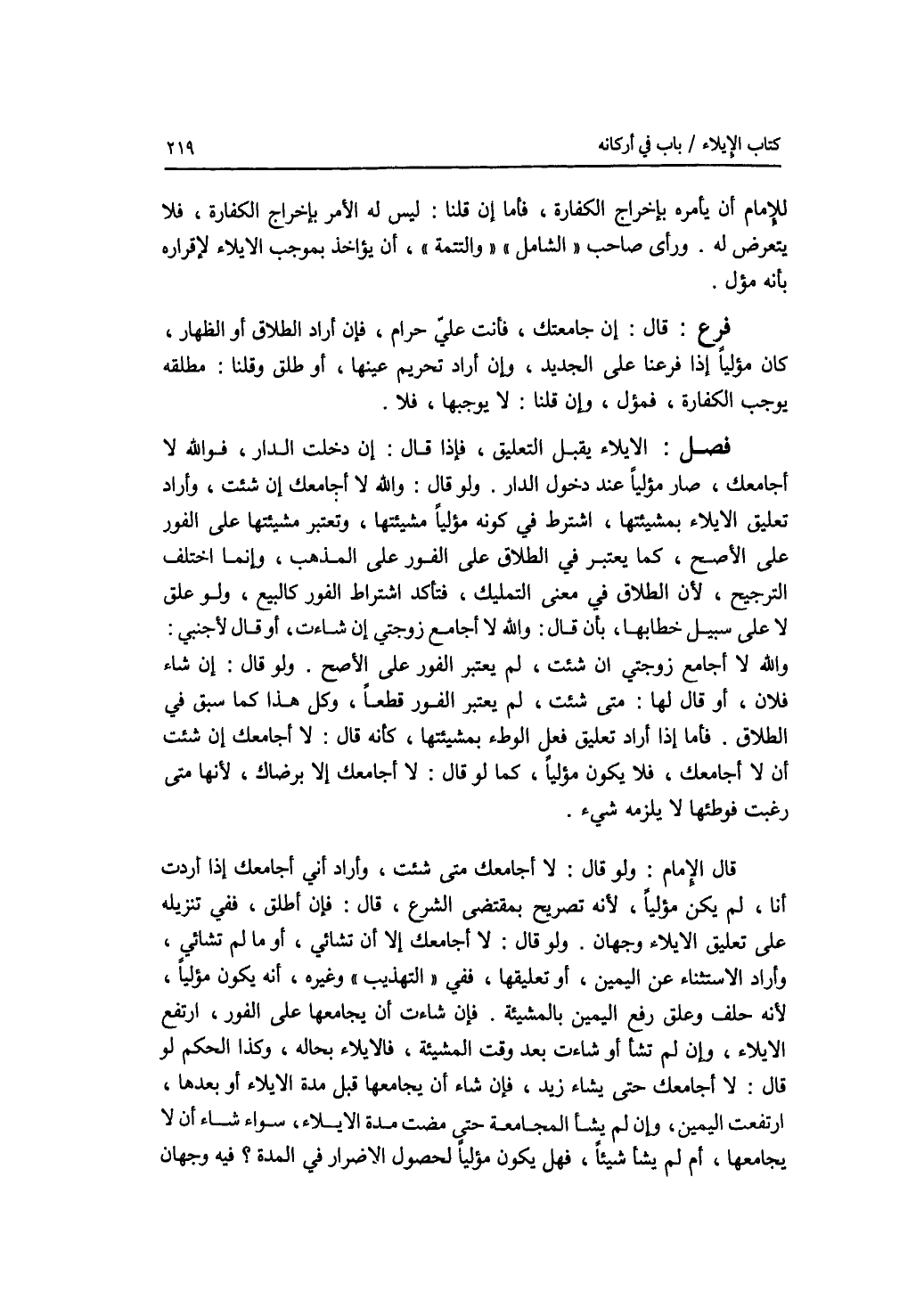 للامام أن يأمره بإخراج الكفارة، فأما إن قلنا: ليس له الامر بإخراج الكفارة، فلا يتعرض له. ورأى صاحب الشامل والتتمة، أن يؤاخذ بموجب الايلاء لاقراره بأنه مؤل. فرع قال: إن جامعتك، فأنت علي حرام، فإن أراد الطلاق أو الظهار، كان مؤليا إذا فرعنا على الجديد، وإن أراد تحريم عينها، أو طلق وقلنا: مطلقه يوجب الكفارة، فمؤل، وإن قلنا: لا يوجبها، فلا. فصل الايلاء يقبل التعليق، فإذا قال: إن دخلت الدار، فوالله لا أجامعك، صار مؤليا عند دخول الدار. ولو قال: والله لا أجامعك إن شئت، وأراد تعليق الايلاء بمشيئتها، اشترط في كونه مؤليا مشيئتها، وتعتبر مشيئتها على الفور على الاصح، كما يعتبر في الطلاق على الفور على المذهب، وإنما اختلف الترجيح، لان الطلاق في معنى التمليك، فتأكد اشتراط الفور كالبيع، ولو علق لا على سبيل خطابها، بأن قال: والله لا أجامع زوجتي إن شاءت، أو قال لاجنبي: والله لا أجامع زوجتي إن شئت، لم يعتبر الفور على الاصح. ولو قال: إن شاء فلان، أو قال لها: متى شئت، لم يعتبر الفور قطعا، وكل هذا كما سبق في الطلاق. فأما إذا أراد تعليق فعل الوطئ بمشيئتها، كأنه قال: لا أجامعك إن شئت أن لا أجامعك، فلا يكون مؤليا، كما لو قال: لا أجامعك إلا برضاك، لانها متى رغبت فوطئها لا يلزمه شئ. قال الامام: ولو قال: لا أجامعك متى شئت، وأراد أني أجامعك إذا أردت أنا، لم يكن مؤليا، لانه تصريح بمقتضى الشرع، قال: فإن أطلق، ففي تنزيله على تعليق الايلاء وجهان. ولو قال: لا أجامعك إلا أن تشائي، أو ما لم تشائي، وأراد الاستثناء عن اليمين، أو تعليقها، ففي التهذيب وغيره، أنه يكون مؤليا، لانه حلف وعلق رفع اليمين بالمشيئة. فإن شاءت أن يجامعها على الفور، ارتفع الايلاء، وإن لم تشأ أو شاءت بعد وقت المشيئة، فالايلاء بحاله، وكذا الحكم لو قال: لا أجامعك حتى يشاء زيد، فإن شاء أن يجامعها قبل مدة الايلاء أو بعدها، ارتفعت اليمين، وإن لم يشأ المجامعة حتى مضت مدة الايلاء، سواء شاء أن لا يجامعها، أم لم يشأ شيئا، فهل يكون مؤليا لحصول الاضرار في المدة ؟ فيه وجهان
