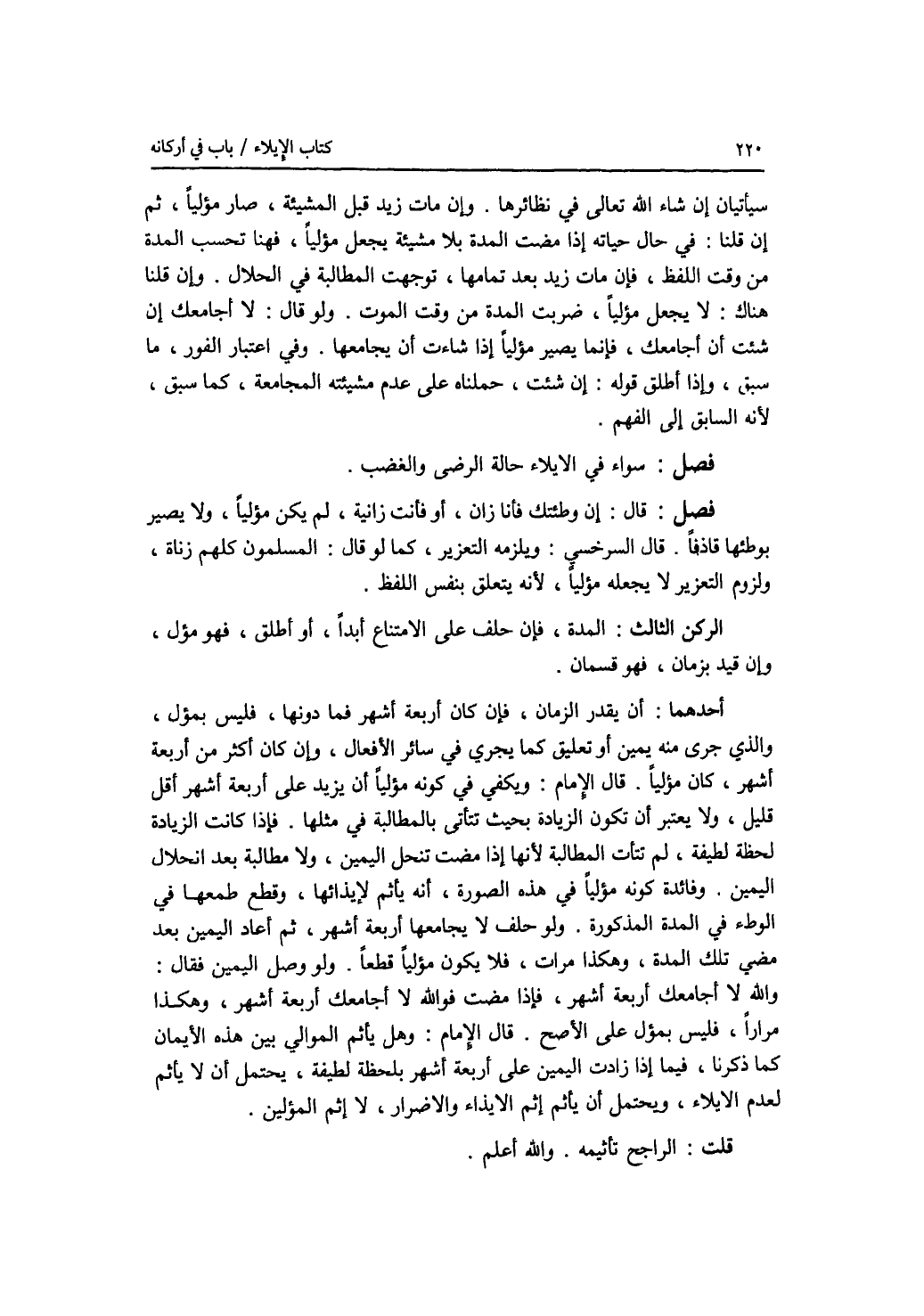 الركن الثالث : المدة، فإن حلف على الامتناع أبدا، أو أطلق، فهو مؤل، وإن قيد بزمان، فهو قسمان. أحدهما: أن يقدر الزمان، فإن كان أربعة أشهر فما دونها، فليس بمؤل، والذي جرى منه يمين أو تعليق كما يجري في سائر الافعال، وإن كان أكثر من أربعة أشهر، كان مؤليا. قال الامام: ويكفي في كونه مؤليا أن يزيد على أربعة أشهر أقل قليل، ولا يعتبر أن تكون الزيادة بحيث تتأتى بالمطالبة في مثلها. فإذا كانت الزيادة لحظة لطيفة، لم تتأت المطالبة لانها إذا مضت تنحل اليمين، ولا مطالبة بعد انحلال اليمين. وفائدة كونه مؤليا في هذه الصورة، أنه يأثم لايذائها، وقطع طمعها في الوطئ في المدة المذكورة. ولو حلف لا يجامعها أربعة أشهر، ثم أعاد اليمين بعد مضي تلك المدة، وهكذا مرات، فلا يكون مؤليا قطعا. ولو وصل اليمين فقال: والله لا أجامعك أربعة أشهر، فإذا مضت فوالله لا أجامعك أربعة أشهر، وهكذا مرارا، فليس بمؤل على الاصح. قال الامام: وهل يأثم الموالي بين هذه الايمان كما ذكرنا، فيما إذا زادت اليمين على أربعة أشهر بلحظة لطيفة، يحتمل أن لا يأثم لعدم الايلاء، ويحتمل أن يأثم إثم الايذاء والاضرار، لا إثم المؤلين. قلت: الراجح تأثيمه. والله أعلم.