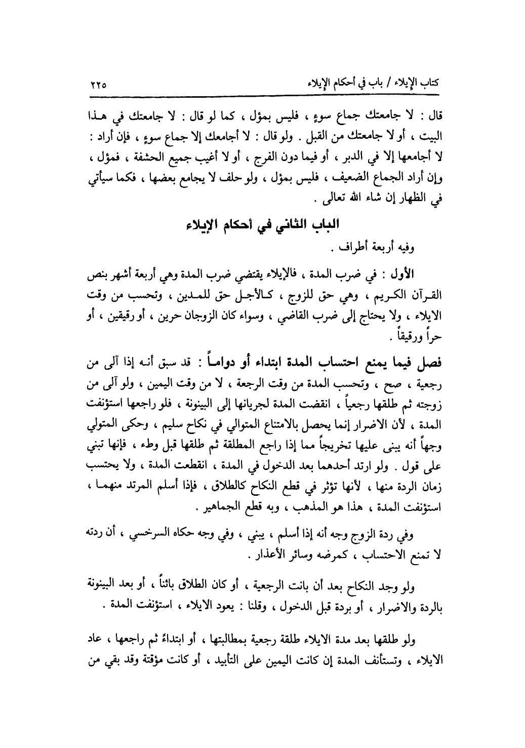 الباب الثاني : في أحكام الايلاء وفيه أربعة اطراف.