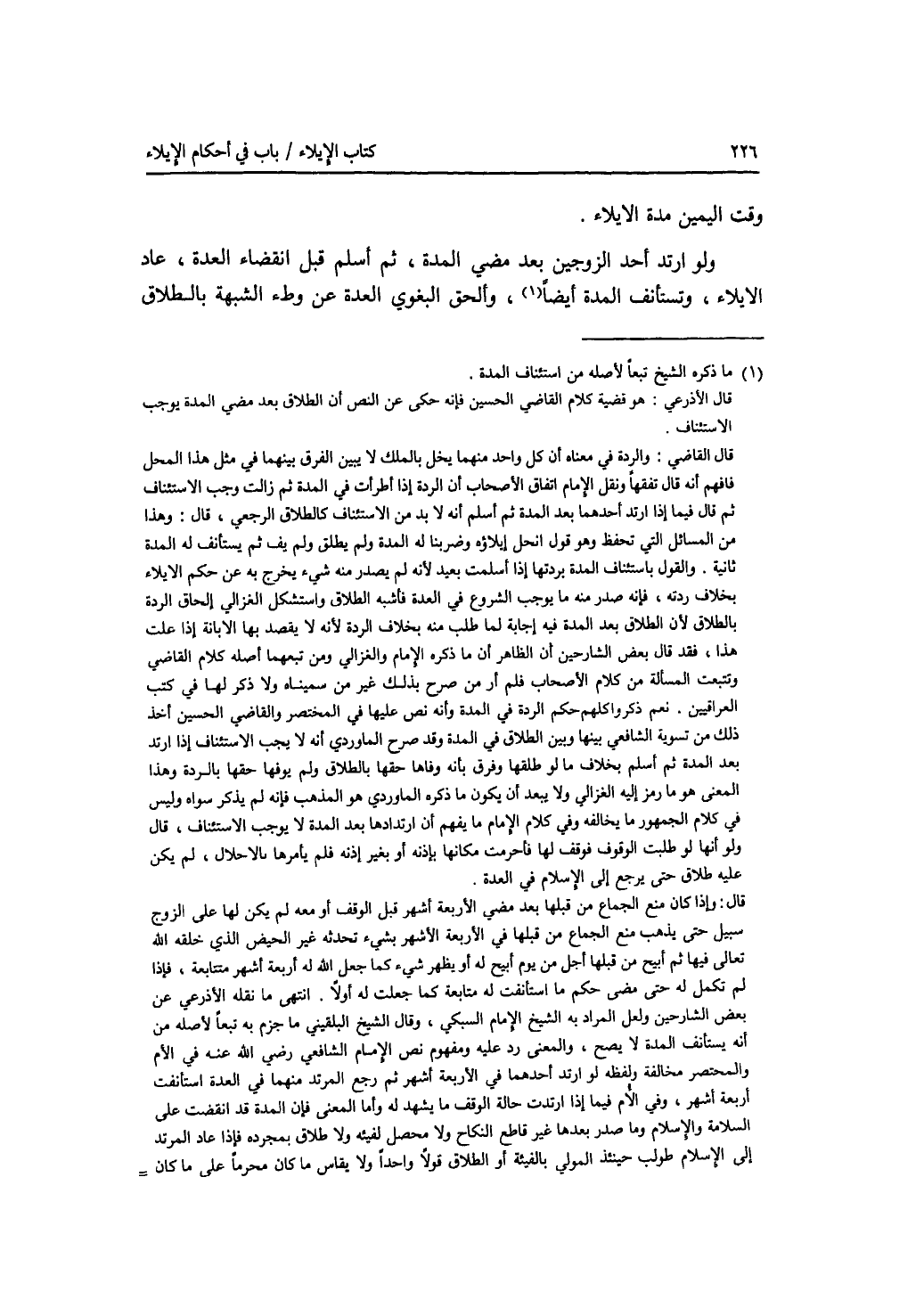 وقت اليمين مدة الايلاء. ولو ارتد أحد الزوجين بعد مضي المدة، ثم أسلم قبل انقضاء العدة، عاد الايلاء، وتستأنف المدة أيضا، وألحق البغوي العدة عن وطئ الشبهة بالطلاق