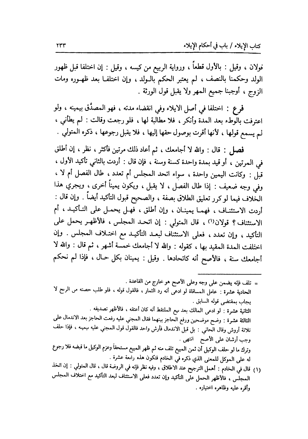 قولان، وقيل: بالاول قطعا، ورواية الربيع من كيسه، وقيل: إن اختلفا قبل ظهور الولد وحكمنا بالنصف، لم يعتبر الحكم بالولد، وإن اختلفا بعد ظهوره وما الزوج، أوجبنا جميع المهر ولا يقبل قول الورثة. فرع اختلفا في أصل الايلاء وفي انقضاء مدته، فهو المصدق بيمينه، ولو اعترفت بالوطئ بعد المدة وأنكر، فلا مطالبة لها، فلو رجعت وقالت: لم يطأني، لم يسمع قولها، لانها أقرت بوصول حقها إليها، فلا يقبل رجوعها، ذكره المتولي. فصل قال: والله لا أجامعك، ثم أعاد ذلك مرتين فأكثر، نظر، إن أطلق في المرتين، أو قيد بمدة واحدة كسنة وسنة، فإن قال: أردت بالثاني تأكيد الاول، قبل، وكانت اليمن واحدة، سواء اتحد المجلس أم تعدد، طال الفصل أم لا، وفي وجه ضعيف: إذا طال الفصل، لا يقبل، ويكون يمينا أخرى، ويجري هذا الخلاف فيما لو كرر تعليق الطلاق بصفة، والصحيح قبول التأكيد أيضا. وإن قال: أردت الاستئناف، فهما يمينان، وإن أطلق، فهل يحمل على التأكيد، أم الاستئناف ؟ قولان. قال المتولي: إن اتحد المجلس، فالاظهر يحمل على التأكيد، وإن تعدد، فعلى الاستئناف لبعد التأكيد مع اختلاف المجلس. وإن اختلفت المدة المقيد بها، كقوله: والله لا أجامعك خمسة أشهر، ثم قال: والله لا أجامعك سنة، فالاصح أنه كاتحادها. وقيل: يمينان بكل حال، فإذا لم نحكم