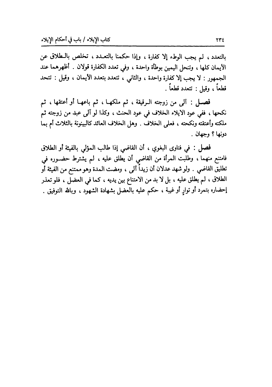 بالتعدد، لم يجب الوطئ إلا كفارة، وإذا حكمنا بالتعدد، تخلص بالطلاق عن الايمان كلها، وتنحل اليمين بوطأة واحدة، وفي تعدد الكفارة قولان. أظهرهما عند الجمهور: لا يجب إلا كفارة واحدة، والثاني، تتعدد بتعدد الايمان، وقيل: تتحد قطعا، وقيل: تتعدد قطعا. فصل آلى من زوجته الرقيقة، ثم ملكها، ثم باعها أو أعتقها، ثم نكحها، ففي عود الايلاء الخلاف في عود الحنث، وكذا لو آلى عبد من زوجته ثم ملكته وأعتقته ونكحته، فعلى الخلاف. وهل الخلاف العائد كالبينونة بالثلاث أم بما دونها ؟ وجهان. فصل في فتاوى البغوي، أن القاضي إذا طالب المؤلي بالفيأة أو الطلاق فامتنع منهما، وطلبت المرأة من القاضي أن يطلق عليه، لم يشترط حضوره في تطليق القاضي. ولو شهد عدلان أن زيدا آلى، ومضت المدة وهو ممتنع من الفيأة أو الطلاق، لم يطلق عليه، بل لا بد من الامتناع بين يديه، كما في العضل، فلو تعذر إحضاره بتمرد أو توار أو غيبة، حكم عليه بالعضل بشهادة الشهود، وبالله التوفيق.