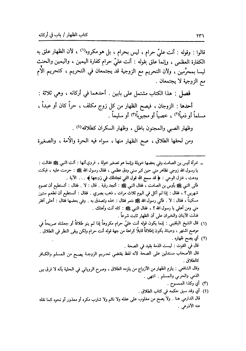 قالوا: وقوله: أنت علي حرام، ليس بحرام، بل هو مكروه، لان الظهار علق به الكفارة العظمى، وإنما علق بقوله: أنت علي حرام كفارة اليمين، واليمين والحنث ليسا بمحرمين، ولان التحريم مع الزوجية قد يجتمعان في التحريم، كتحريم الام مع الزوجية لا يجتمعان. فصل هذا الكتاب مشتمل على بابين.