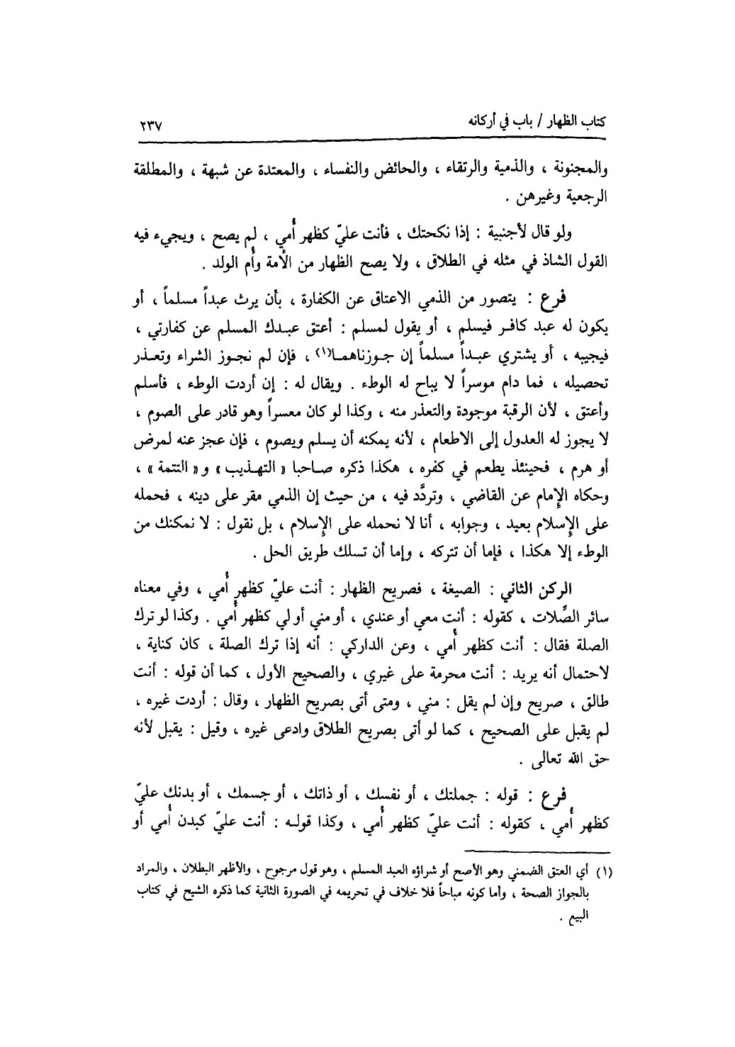 والمجنونة، والذمية والرتقاء، والحائض والنفساء، والمعتدة عن شبهة، والمطلقة الرجعية وغيرهن. ولو قال لاجنبية: إذا نكحتك، فأنت علي كظهر أمي، لم يصح، ويجئ فيه القول الشاذ في مثله في الطلاق، ولا يصح الظهار من الامة وأم الولد. فرع يتصور من الذمي الاعتاق عن الكفارة، بأن يرث عبدا مسلما، أو يكون له عبد كافر فيسلم، أو يقول لمسلم: أعتق عبدك المسلم عن كفارتي، فيجيبه، أو يشتري عبدا مسلما إن جوزناهما، فإن لم نجوز الشراء وتعذر تحصيله، فما دام موسرا لا يباح له الوطئ. ويقال له: إن أردت الوطئ، فأسلم وأعتق، لان الرقبة موجودة والتعذر منه، وكذا لو كان معسرا وهو قادر على الصوم، لا يجوز له العدول إلى الاطعام، لانه يمكنه أن يسلم ويصوم، فإن عجز عنه لمرض أو هرم، فحينئذ يطعم في كفره، هكذا ذكره صاحبا التهذيب والتتمة، وحكاه الامام عن القاضي، وتردد فيه، من حيث إن الذمي مقر على دينه، فحمله على الاسلام بعيد، وجوابه، أنا لا نحمله على الاسلام، بل نقول: لا نمكنك من الوطئ إلا هكذا، فإما أن تتركه، وإما أن تسلك طريق الحل.