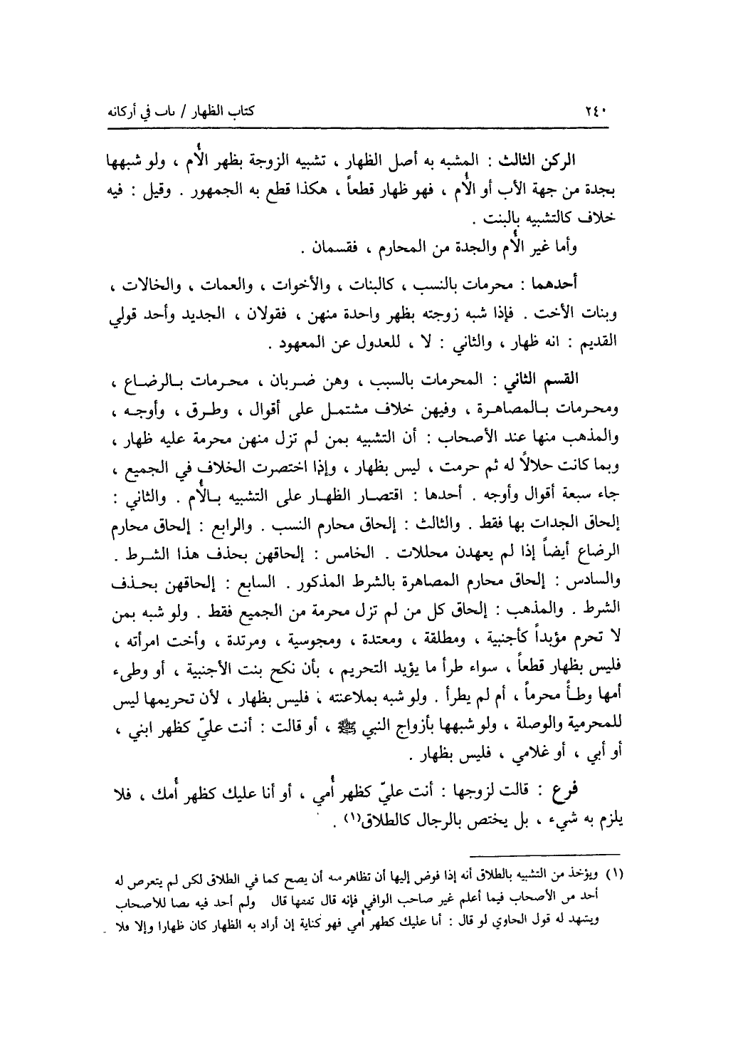 الركن الثالث : المشبه به أصل الظهار، تشبيه الزوجة بظهر الام، ولو شبهها بجدة من جهة الاب أو الام، فهو ظهار قطعا، هكذا قطع به الجمهور. وقيل: فيه خلاف كالتشبيه بالبنت. وأما غير الام والجدة من المحارم، فقسمان. أحدهما: محرمات بالنسب، كالبنات، والاخوات، والعمات، والخالات، وبنات الاخت. فإذا شبه زوجته بظهر واحدة منهن، فقولان، الجديد وأحد قولي القديم: أنه ظهار، والثاني: لا، للعدول عن المعهود. القسم الثاني: المحرمات بالسبب، وهن ضربان، محرمات بالرضاع، ومحرمات بالمصاهرة، وفيهن خلاف مشتمل على أقوال، وطرق، وأوجه، والمذهب منها عند الاصحاب: أن التشبيه بمن لم تزل منهن محرمة عليه ظهار، وبما كانت حلالا له ثم حرمت، ليس بظهار، وإذا اختصرت الخلاف في الجميع، جاء سبعة أقوال وأوجه. أحدها: اقتصار الظهار على التشبيه بالام. والثاني: إلحاق الجدات بها فقط. والثالث: إلحاق محارم النسب. والرابع: إلحاق محارم الرضاع أيضا إذا لم يعهدن محللات. الخامس: إلحاقهن بحذف هذا الشرط. والسادس: إلحاق محارم المصاهرة بالشرط المذكور. السابع: إلحاقهن بحذف الشرط. والمذهب: إلحاق كل من لم تزل محرمة من الجميع فقط. ولو شبه بمن لا تحرم مؤبدا كأجنبية، ومطلقة، ومعتدة، ومجوسية، ومرتدة، وأخت امرأته، فليس بظهار قطعا، سواء طرأ ما يؤيد التحريم، بأن نكح بنت الاجنبية، أو وطئ أمها وطءا محرما، أم لم يطرأ. ولو شبه بملاعنته، فليس بظهار، لان تحريمها ليس للمحرمية والوصلة، ولو شبهها بأزواج النبي - صلى الله عليه وسلم -، أو قالت: أنت علي كظهر ابني، أو أبي، أو غلامي، فليس بظهار. فرع قالت لزوجها: أنت علي كظهر أمي، أو أنا عليك كظهر أمك، فلا يلزم به شئ، بل يختص بالرجال (كالطلاق).