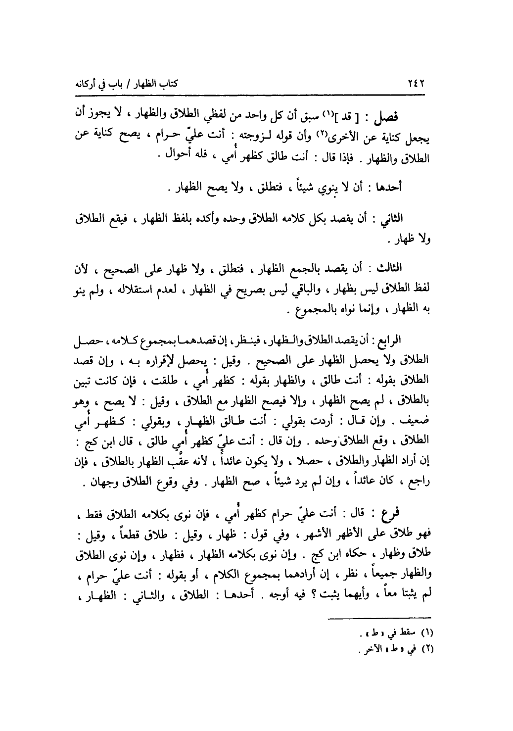 فصل سبق أن كل واحد من لفظي الطلاق والظهار، لا يجوز أن يجعل كناية عن الآخر، وأن قوله لزوجته: أنت علي حرام، يصح كناية عن الطلاق والظهار. فإذا قال: أنت طالق كظهر أمي، فله أحوال. أحدها: أن لا ينوي شيئا، فتطلق، ولا يصح الظهار. الثاني: أن يقصد بكل كلامه الطلاق وحده وأكده بلفظ الظهار، فيقع الطلاق ولا ظهار. الثالث: أن يقصد بالجمع الظهار، فتطلق، ولا ظهار على الصحيح، لان لفظ الطلاق ليس بظهار، والباقي ليس بصريح في الظهار، لعدم استقلاله، ولم ينو به الظهار، وإنما نواه بالمجموع. الرابع: أن يقصد الطلاق والظهار، فينظر، إن قصدهما بمجموع كلامه، حصل الطلاق ولا يحصل الظهار على الصحيح. وقيل: يحصل لاقراره به، وإن قصد الطلاق بقوله: أنت طالق، والظهار بقوله: كظهر أمي، طلقت، فإن كانت تبين بالطلاق، لم يصح الظهار، وإلا فيصح الظهار مع الطلاق، وقيل: لا يصح، وهو ضعيف. وإن قال: أردت بقولي: أنت طالق الظهار، وبقولي: كظهر أمي الطلاق، وقع الطلاق وحده. وإن قال: أنت علي كظهر أمي طالق، قال ابن كج: إن أراد الظهار والطلاق، حصلا، ولا يكون عائدا، لانه عقب الظهار بالطلاق، فإن راجع، كان عائدا، وإن لم يرد شيئا، صح الظهار. وفي وقوع الطلاق وجهان. فرع قال: أنت علي حرام كظهر أمي، فإن نوى بكلامه الطلاق فقط، فهو طلاق على الاظهر الاشهر، وفي قول: ظهار، وقيل: طلاق قطعا، وقيل: طلاق وظهار، حكاه ابن كج. وإن نوى بكلامه الظهار، فظهار، وإن نوى الطلاق والظهار جميعا، نظر، إن أرادهما بمجموع الكلام، أو بقوله: أنت علي حرام، لم يثبتا معا، وأيهما يثبت ؟ فيه أوجه. أحدها: الطلاق، والثاني: الظهار،