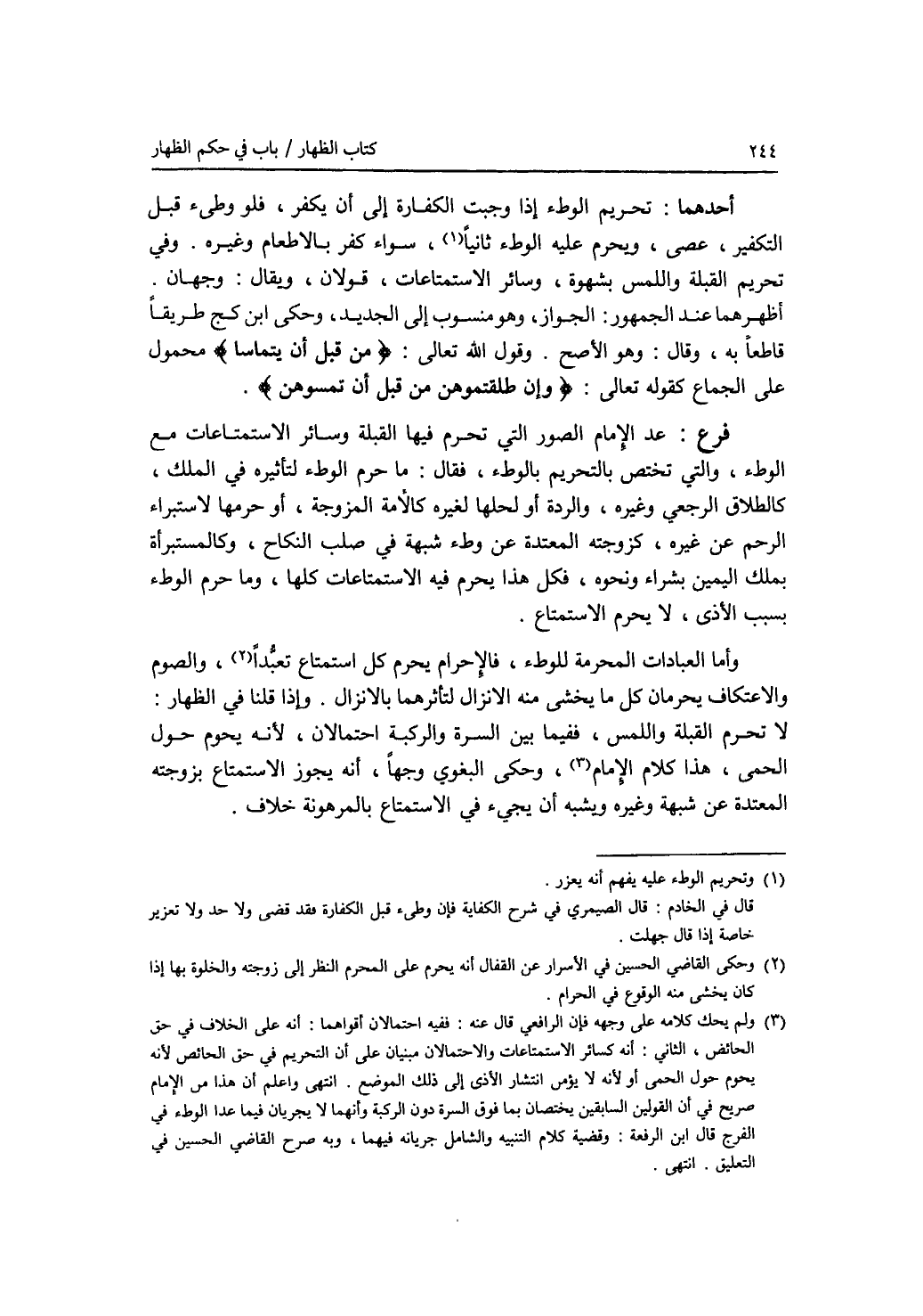 أحدهما : تحريم الوطئ إذا وجبت الكفارة إلى أن يكفر، فلو وطئ قبل التكفير، عصى، ويحرم عليه الوطئ ثانيا، سواء كفر بالاطعام وغيره. وفي تحريم القبلة واللمس بشهوة، وسائر الاستمتاعات، قولان، ويقال: وجهان، أظهرهما عند الجمهور: الجواز، وهو منسوب إلى الجديد، وحكى ابن كج طريقا قاطعا به، وقال: وهو الاصح. وقول الله تعالى: * (من قبل أن يتماسا) * محمول على الجماع كقوله تعالى: * (وإن طلقتموهن من قبل أن تمسوهن) *. فرع عد الامام الصور التي تحرم فيها القبلة وسائر الاستمتاعات مع الوطئ، والتي تختص بالتحريم بالوطئ، فقال: ما حرم الوطئ لتاثيره في الملك، كالطلاق الرجعي وغيره، والردة أو لحلها لغيره كالامة المزوجة، أو حرمها لاستبراء الرحم عن غيره، كزوجته المعتدة عن وطئ شبهة في صلب النكاح، وكالمستبرأة بملك اليمين بشراء ونحوه، فكل هذا يحرم فيه الاستمتاعات كلها، وما حرم الوطئ بسبب الاذى، لا يحرم الاستمتاع. وأما العبادات المحرمة للوطئ، فالاحرام يحرم كل استمتاع تعبدا، والصوم والاعتكاف يحرمان كل ما يخشى منه الانزال لتأثرهما بالانزال. وإذا قلنا في الظهار: لا تحرم القبلة واللمس، ففيما بين السرة والركبة احتمالان، لانه يحوم حول الحمى، هذا كلام الامام، وحكى البغوي وجها، أنه يجوز الاستمتاع بزوجته المعتدة عن شبهة وغيره ويشبه أن يجئ في الاستمتاع بالمرهونة خلاف.