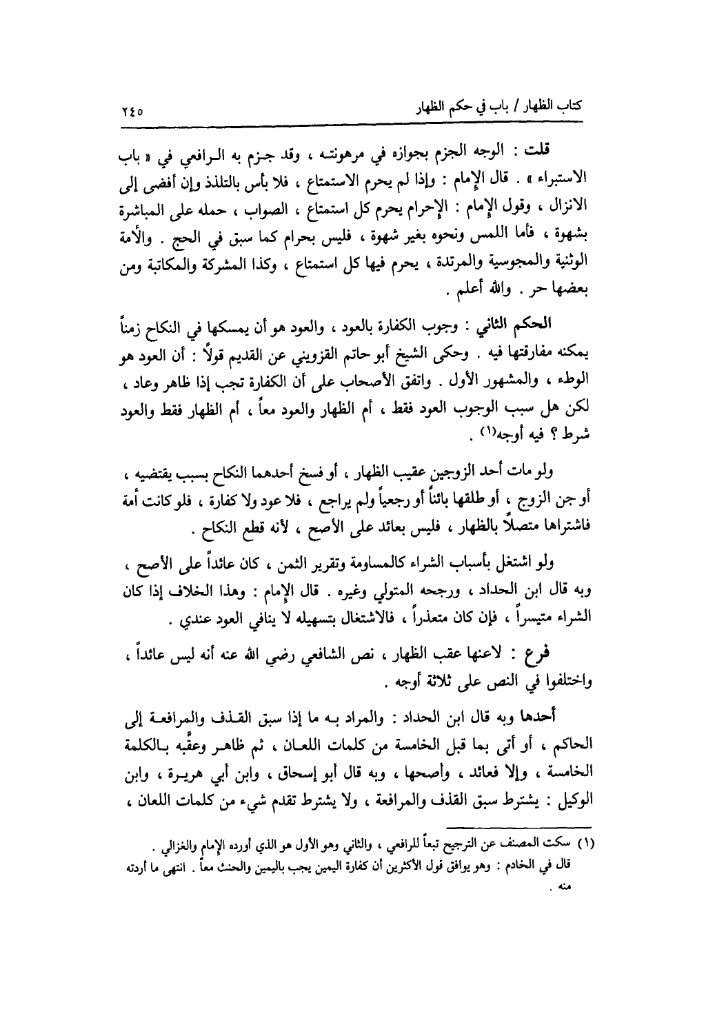 الحكم الثاني : وجوب الكفارة بالعود، والعود هو أن يمسكها في النكاح زمنا يمكنه مفارقتها فيه. وحكى الشيخ أبو حاتم القزويني عن القديم قولا: أن العود هو الوطئ، والمشهور الاول. واتفق الاصحاب على أن الكفارة تجب إذا ظاهر وعاد، لكن هل سبب الوجوب العود فقط، أم الظهار والعود معا، أم الظهار فقط والعود شرط ؟ فيه أوجه. ولو مات أحد الزوجين عقيب الظهار، أو فسخ أحدهما النكاح بسبب يقتضيه، أو جن الزوج، أو طلقها بائنا أو رجعيا ولم يراجع، فلا عود ولا كفارة، فلو كانت أمة فاشتراها متصلا بالظهار، فليس بعائد على الاصح، لانه قطع النكاح. ولو اشتغل بأسباب الشراء كالمساومة وتقرير الثمن، كان عائدا على الاصح، وبه قال ابن الحداد، ورجحه المتولي وغيره. قال الامام: وهذا الخلاف إذا كان الشراء متيسرا، فإن كان متعذرا، فالاشتغال بتسهيله لا ينافي العود عندي. فرع لاعنها عقب الظهار، نص الشافعي رضي الله عنه أنه ليس عائدا، واختلفوا في النص على ثلاثة أوجه. أحدها: وبه قال ابن الحداد: والمراد به ما إذا سبق القذف والمرافعة إلى الحاكم، أو أتى بما قبل الخامسة من كلمات اللعان، ثم ظاهر وعقبه بالكلمة الخامسة، وإلا فعائد، وأصحها، وبه قال أبو إسحق، وابن أبي هريرة، وابن الوكيل: يشترط سبق القذف والمرافعة، ولا يشترط تقدم شئ من كلمات اللعان،