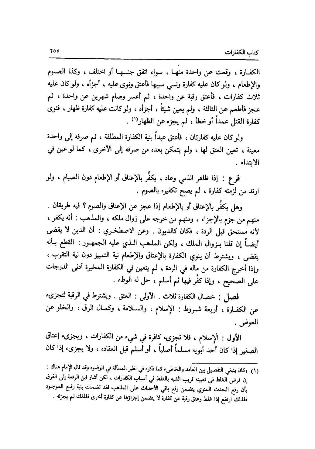 الكفارة، وقعت عن واحدة منها، سواء اتفق جنسها أو اختلف، وكذا الصوم والاطعام، ولو كان عليه كفارة ونسي سببها فأعتق ونوى عليه، أجزأه، ولو كان عليه ثلاث كفارات، فأعتق رقبة عن واحدة، ثم أعسر وصام شهرين عن واحدة، ثم عجز فأطعم عن الثالثة، ولم يعين شيئا، أجزأه، ولو كانت عليه كفارة ظهار، فنوى كفارة القتل عمدا أو خطأ، لم يجزه عن الظهار. ولو كان عليه كفارتان، فأعتق عبدا بنية الكفارة المطلقة، ثم صرفه إلى واحدة معينة، تعين العتق لها، ولم يتمكن بعده من صرفه إلى الاخرى، كما لو عين في الابتداء. فرع إذا ظاهر الذمي وعاد، يكفر بالاعتاق أو الاطعام دون الصيام، ولو ارتد من لزمته كفارة، لم يصح تكفيره بالصوم. وهل يكفر بالاعتاق أو بالاطعام إذا عجز عن الاعتاق والصوم ؟ فيه طريقان. منهم من جزم بالاجزاء، ومنهم من خرجه على زوال ملكه، والمذهب: أنه يكفر، لانه مستحق قبل الردة، فكان كالديون. وعن الاصطخري: أن الدين لا يقضى أيضا إن قلنا بزوال الملك، ولكن المذهب الذي عليه الجمهور: القطع بأنه يقضى، ويشترط أن ينوي الكفارة بالاعتاق والاطعام نية التمييز دون نية التقرب، وإذا أخرج الكفارة من مالة في الردة، لم يتعين في الكفارة المخيرة أدنى الدرجات على الصحيح، وإذا كفر فيها ثم أسلم، حل له الوطئ.