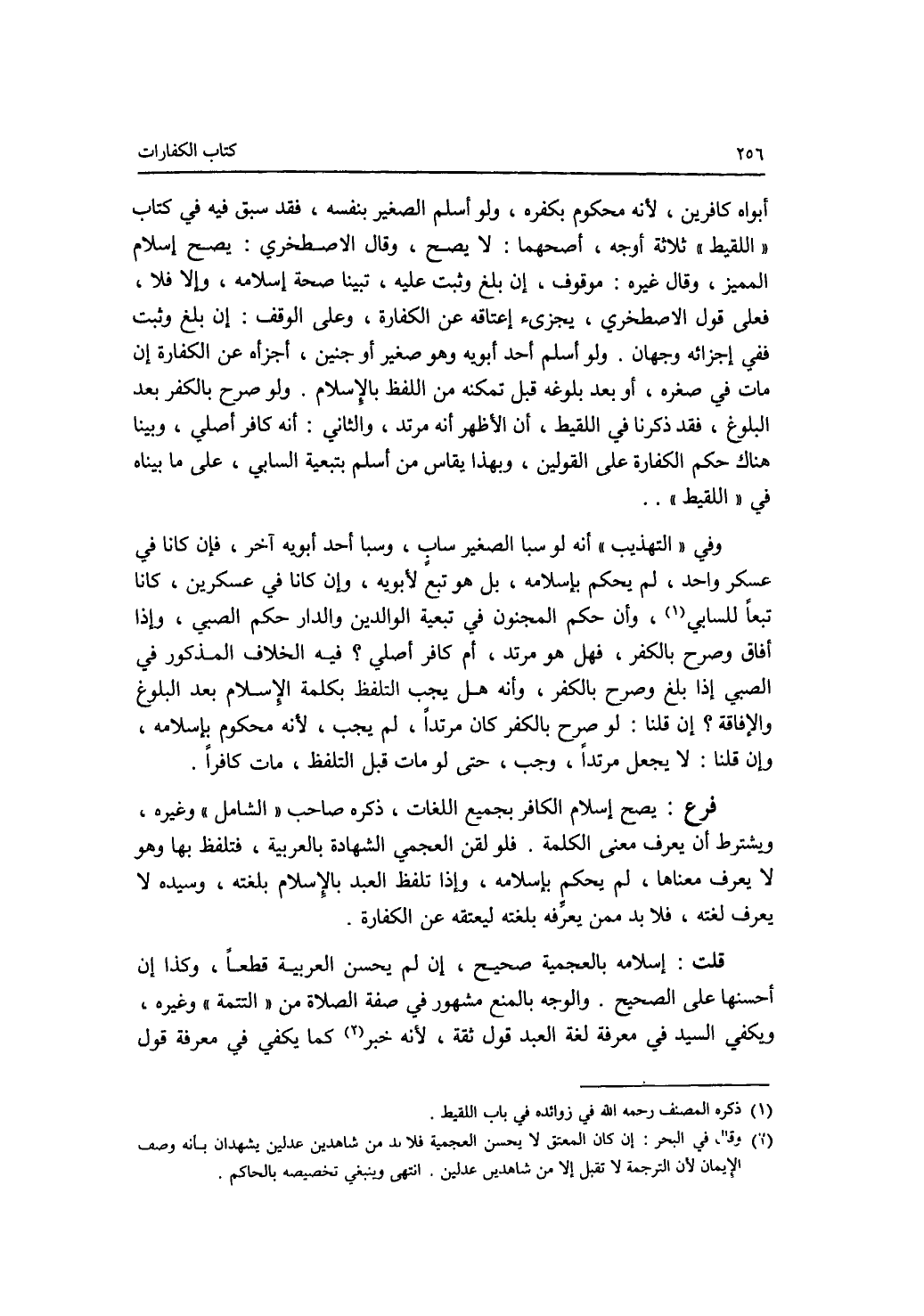 أبواه كافرين، لانه محكوم بكفره، ولو أسلم الصغير بنفسه، فقد سبق فيه في كتاب اللقيط ثلاثة أوجه، أصحهما: لا يصح، وقال الاصطخري: يصح إسلام المميز، وقال غيره: موقوف، إن بلغ وثبت عليه، تبينا صحة إسلامه، وإلا فلا، فعلى قول الاصطخري، يجزئ إعتاقه عن الكفارة، وعلى الوقف: إن بلغ وثبت ففي إجزائه وجهان. ولو أسلم أحد أبويه وهو صغير أو جنين، أجزأه عن الكفارة إن مات في صغره، أو بعد بلوغه قبل تمكنه من اللفظ بالاسلام. ولو صرح بالكفر بعد البلوغ، فقد ذكرنا في اللقيط، أن الاظهر أنه مرتد، والثاني: أنه كافر أصلي، وبينا هناك حكم الكفارة على القولين، وبهذا يقاس من أسلم بتبعية السابي، على ما بيناه في اللقيط. وفي التهذيب أنه لو سبا الصغير ساب، وسبا أحد أبويه آخر، فإن كانا في عسكر واحد، لم يحكم بإسلامه، بل هو تبع لابويه، وإن كانا في عسكرين، كانا تبعا للسابي، وأن حكم المجنون في تبعية الوالدين والدار حكم الصبي، وإذا أفاق وصرح بالكفر، فهل هو مرتد، أم كافر أصلي ؟ فيه الخلاف المذكور في الصبي إذا بلغ وصرح بالكفر، وأنه هل يجب التلفظ بكلمة الاسلام بعد البلوغ والافاقة ؟ إن قلنا: لو صرح بالكفر كان مرتدا، لم يجب، لانه محكوم بإسلامه، وإن قلنا: لا يجعل مرتدا، وجب، حتى لو مات قبل التلفظ، مات كافرا. فرع يصح إسلام الكافر بجميع اللغات، ذكره صاحب الشامل وغيره، ويشترط أن يعرف معنى الكلمة. فلو لقن العجمي الشهادة بالعربية، فتلفظ بها وهو لا يعرف معناها، لم يحكم بإسلامه، وإذا تلفظ العبد بالاسلام بلغته، وسيده لا يعرف لغته، فلا بد ممن يعرفه بلغته ليعتقه عن الكفارة. قلت: إسلامه بالعجمية صحيح، إن لم يحسن العربية قطعا، وكذا إن أحسنها على الصحيح. والوجه بالمنع مشهور في صفة الصلاة من التتمة وغيره، ويكفي السيد في معرفة لغة العبد قول ثقة، لانه خبر، كما يكفي في معرفة قول