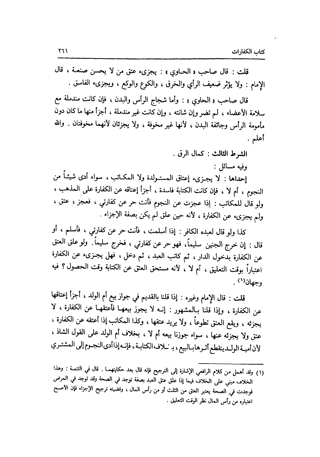قلت: قال صاحب الحاوي: يجزئ عتق من لا يحسن صنعة، قال الامام: ولا يؤثر ضعيف الرأي والخرق، والكوع والوكع، ويجزئ الفاسق. قال صاحب الحاوي: وأما شجاج الرأس والبدن، فإن كانت مندملة مع سلامة الاعضاء، لم تضر وإن شانته، وإن كانت غير مندملة، أجزأ منها ما كان دون مأمومة الرأس وجائفة البدن، لانها غير مخوفة، ولا يجزئان لانهما مخوفتان. والله أعلم. الشرط الثالث: كمال الرق. وفيه مسائل: إحداها: لا يجزئ إعتاق المستولدة ولا المكاتب، سواء أدى شيئا من النجوم، أم لا، فإن كانت الكتابة فاسدة، أجزأ إعتاقه عن الكفارة على المذهب، ولو قال للمكاتب: إذا عجزت عن النجوم فأنت حر عن كفارتي، فعجز، عتق، ولم يجزئ عن الكفارة، لانه حين علق لم يكن بصفة الاجزاء. كذا ولو قال لعبده الكافر: إذا أسلمت، فأنت حر عن كفارتي، فأسلم، أو قال: إن خرج الجنين سليما، فهو حر عن كفارتي، فخرج سليما. ولو علق العتق عن الكفارة بدخول الدار، ثم كاتب العبد، ثم دخل، فهل يجزئ عن الكفارة اعتبارا بوقت التعليق، أم لا، لانه مستحق العتق عن الكتابة وقت الحصول ؟ فيه وجهان. قلت: قال الامام وغيره: إذا قلنا بالقديم في جواز بيع أم الولد، أجزأ إعتاقها عن الكفارة، وإذا قلنا بالمشهور: إنه لا يجوز بيعها فأعتقها عن الكفارة، لا يجزئه، ويقع العتق تطوعا، ولا يريد عتقها، وكذا المكاتب إذا أعتقه عن الكفارة، عتق ولا يجزئه عنها، سواء جوزنا بيعه أم لا، بخلاف أم الولد على القول الشاذ، لان أمية الولد ينقطع أثرها بالبيع، بخلاف الكتابة، فإنه إذا أدى النجوم إلى المشتري