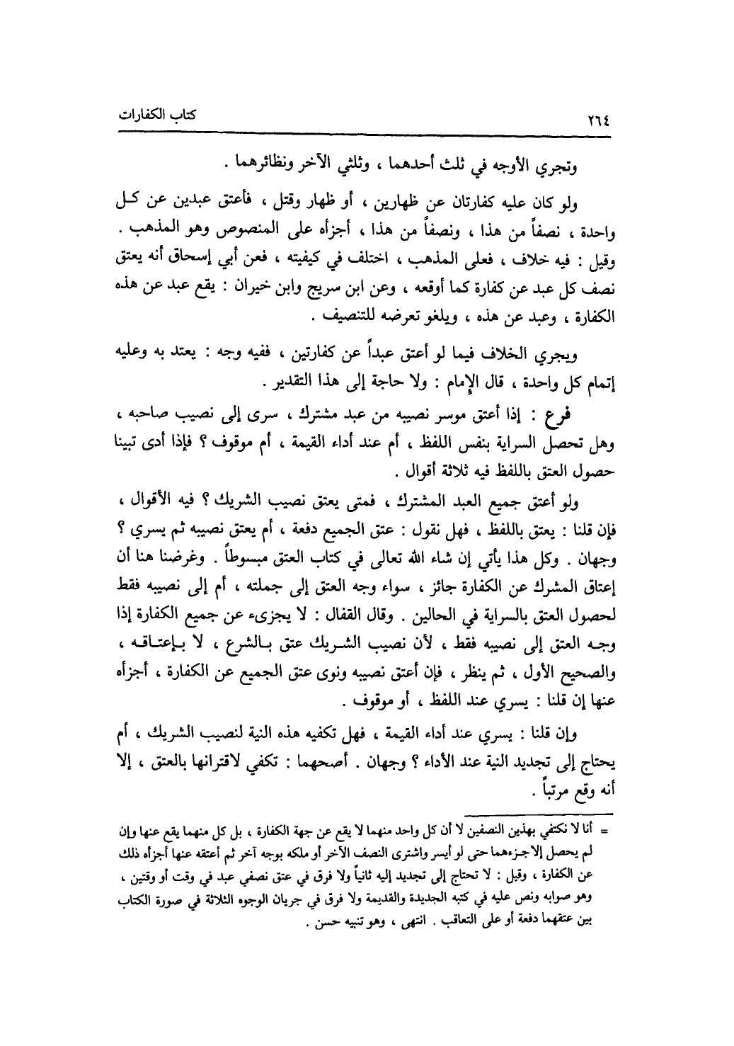وتجري الاوجه في ثلث أحدهما، وثلثي الآخر ونظائرهما. ولو كان عليه كفارتان عن ظهارين، أو ظهار وقتل، فأعتق عبدين عن كل واحدة، نصفا من هذا، ونصفا من هذا، أجزأه على المنصوص وهو المذهب. وقيل: فيه خلاف، فعلى المذهب، اختلف في كيفيته، فعن أبي إسحق أنه يعتق نصف كل عبد عن كفارة كما أوقعه، وعن ابن سريج وابن خيران: يقع عبد عن هذه الكفارة، وعبد عن هذه، ويلغو تعرضه للتنصيف. ويجري الخلاف فيما لو أعتق عبدا عن كفارتين، ففيه وجه: يعتد به وعليه إتمام كل واحدة، قال الامام: ولا حاجة إلى هذا التقدير. فرع إذا أعتق موسر نصيبه من عبد مشترك، سرى إلى نصيب صاحبه، وهل تحصل السراية بنفس اللفظ، أم عند أداء القيمة، أم موقوف ؟ فإذا أدى تبينا حصول العتق باللفظ فيه ثلاثة أقوال. ولو أعتق جميع العبد المشترك، فمتى يعتق نصيب الشريك ؟ فيه الاقوال، فإن قلنا: يعتق باللفظ، فهل نقول: عتق الجميع دفعة، أم يعتق نصيبه ثم يسري ؟ وجهان. وكل هذا يأتي إن شاء الله تعالى (في كتاب العتق) مبسوطا. وغرضنا هنا أن إعتاق المشرك عن الكفارة جائز، سواء وجه العتق إلى جملته، أم إلى نصيبه فقط لحصول العتق بالسراية في الحالين. وقال القفال: لا يجزئ عن جميع الكفارة إذا وجه العتق إلى نصيبه فقط، لان نصيب الشريك عتق بالشرع، لا بإعتاقه، والصحيح الاول، ثم ينظر، فإن أعتق نصيبه ونوى عتق الجميع عن الكفارة، أجزاه عنها إن قلنا: يسري عند اللفظ، أو موقوف. وإن قلنا: يسري عند أداء القيمة، فهل تكفيه هذه النية لنصيب الشريك، أم يحتاج إلى تجديد النية عند الاداء ؟ وجهان. أصحهما: تكفي لاقترانها بالعتق، إلا أنه وقع مرتبا.
