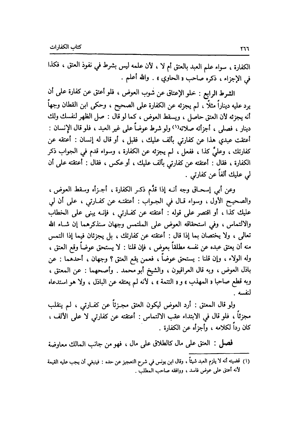 الكفارة، سواء علم العبد بالعتق أم لا، لان علمه ليس بشرط في نفوذ العتق، فكذا في الاجزاء، ذكره صاحب الحاوي. والله أعلم. الشرط الرابع: خلو الاعتاق عن شوب العوض، فلو أعتق عن كفارة على أن يرد عليه دينارا مثلا، لم يجزئه عن الكفارة على الصحيح، وحكى ابن القطان وجها أنه يجزئه لان العتق حاصل، ويسقط العوض، كما لو قال: أصل الظهر لنفسك ولك دينار، فصلى، أجزأته صلاته ولو شرط عوضا على غير العبد، فلو قال الانسان: أعتقت عبدي هذا عن كفارتي بألف عليك، فقبل، أو قال له إنسان: أعتقه عن كفارتك، وعلي كذا، ففعل، لم يجزئه عن الكفارة، وسواء قدم في الجواب ذكر الكفارة، فقال: أعتقته عن كفارتي بألف عليك، أو عكس، فقال: أعتقته على أن لي عليك ألفا عن كفارتي. وعن أبي إسحق وجه أنه إذا قدم ذكر الكفارة، أجزأه وسقط العوض، والصحيح الاول، وسواء قال في الجواب: أعتقته عن كفارتي، على أن لي عليك كذا، أو اقتصر على قوله: أعتقته عن كفارتي، فإنه يبنى على الخطاب والالتماس، وفي استحقاقه العوض على الملتمس وجهان سنذكرهما إن شاء الله تعالى، ولا يختصان بما إذا قال: أعتقته عن كفارتك، بل يجزئان فيما إذا التمس منه أن يعتق عبده عن نفسه مطلقا بعوض، فإن قلنا: لا يستحق عوضا وقع العتق، وله الولاء، وإن قلنا: يستحق عوضا، فعمن يقع العتق ؟ وجهان، أحدهما: عن باذل العوض، وبه قال العراقيون، والشيخ أبو محمد. وأصحهما: عن المعتق، وبه قطع صاحبا المهذب والتتمة، لانه لم يعتقه عن الباذل، ولا هو استدعاه لنفسه. ولو قال المعتق: أرد العوض ليكون العتق مجزئا عن كفارتي، لم ينقلب مجزئا، فلو قال في الابتداء عقب الالتماس: أعتقته عن كفارتي لا على الالف، كان ردا لكلامه، وأجزأه عن الكفارة.
