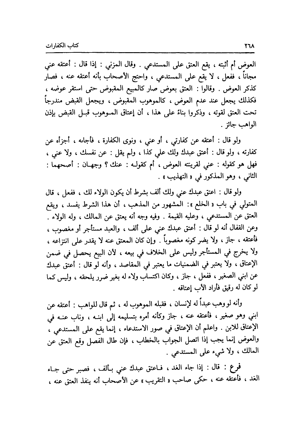 العوض أم أثبته، يقع العتق على المستدعي. وقال المزني: إذا قال: أعتقه عني مجانا، ففعل، لا يقع على المستدعي، واحتج الاصحاب بأنه أعتقه عنه، فصار كذكر العوض. وقالوا: العتق بعوض صار كالمبيع المقبوض حتى استقر عوضه، فكذلك يجعل عند عدم العوض، كالموهوب المقبوض، ويجعل القبض مندرجا تحت العتق لقوته، وذكروا بناء على هذا، أن إعتاق الموهوب قبل القبض بإذن الواهب جائز. ولو قال: أعتقه عن كفارتي، أو عني، ونوى الكفارة، فأجابه، أجزأه عن كفارته، ولو قال: أعتق عبدك ولك علي كذا، ولم يقل: عن نفسك، ولا عني، فهل هو كقوله: عني لقرينته العوض، أم كقوله: عنك ؟ وجهان: أصحهما: الثاني، وهو المذكور في التهذيب. ولو قال: أعتق عبدك عني ولك ألف بشرط أن يكون الولاء لك، ففعل، قال المتولي في باب الخلع: المشهور من المذهب، أن هذا الشرط يفسد، ويقع العتق عن المستدعي، وعليه القيمة. وفيه وجه أنه يعتق عن المالك، وله الولاء. وعن القفال أنه لو قال: أعتق عبدك عني على ألف، والعبد مستأجر أو مغصوب، فأعتقه، جاز، ولا يضر كونه مغصوبا. وإن كان المعتق عنه لا يقدر على انتزاعه، ولا يخرج في المستأجر وليس على الخلاف في بيعه، لان البيع يحصل في ضمن الاعتاق، ولا يعتبر في الضمنيات ما يعتبر في المقاصد، وأنه لو قال: أعتق عبدك عن ابني الصغير، ففعل، جاز، وكان اكتساب ولاء له بغير ضرر يلحقه، وليس كما لو كان له رقيق فأراد الاب إعتاقه. وأنه لو وهب عبدا له لانسان، فقبله الموهوب له، ثم قال للواهب: أعتقه عن ابني وهو صغير، فأعتقه عنه، جاز وكأنه أمره بتسليمه إلى ابنه، وناب عنه في الاعتاق للابن. واعلم أن الاعتاق في صور الاستدعاء، إنما يقع على المستدعي، والعوض إنما يجب إذا اتصل الجواب بالخطاب، فإن طال الفصل وقع العتق عن المالك، ولا شئ على المستدعي. فرع قال: إذا جاء الغد، فأعتق عبدك عني بألف، فصبر حتى جاء الغد، فأعتقه عنه، حكى صاحب التقريب عن الاصحاب أنه ينفذ العتق عنه،
