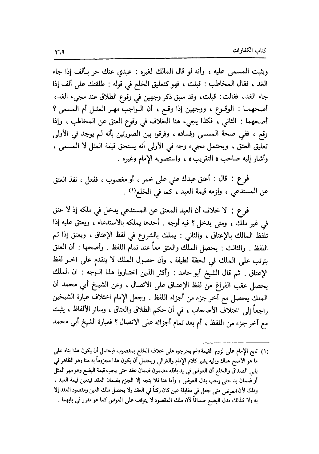 ويثبت المسمى عليه، وأنه لو قال المالك لغيره: عبدي عنك حر بألف إذا جاء الغد، فقال المخاطب: قبلت، فهو كتعليق الخلع في قوله: طلقتك على ألف إذا جاء الغد، فقالت: قبلت، وقد سبق ذكر وجهين في وقوع الطلاق عند مجئ الغد، أصحهما: الوقوع، ووجهين إذا وقع، أن الواجب مهر المثل أم المسمى ؟ أصحهما: الثاني، فكذا يجئ هنا الخلاف في وقوع العتق عن المخاطب، وإذا وقع، ففي صحة المسمى وفساده، وفرقوا بين الصورتين بأنه لم يوجد في الاولى تعليق العتق، ويحتمل مجئ وجه في الاولى أنه يستحق قيمة المثل لا المسمى، وأشار إليه صاحب التقريب، واستصوبه الامام وغيره. فرع قال: أعتق عبدك عني على خمر، أو مغصوب، ففعل، نفذ العتق عن المستدعي، ولزمه قيمة العبد، كما في الخلع. فرع لا خلاف أن العبد المعتق عن المستدعي يدخل في ملكه إذ لا عتق في غير ملك، ومتى يدخل ؟ فيه أوجه. أحدها يملكه بالاستدعاء، ويعتق عليه إذا تلفظ المالك بالاعتاق، والثاني: يملك بالشروع في لفظ الاعتاق، ويعتق إذا تم اللفظ. والثالث: يحصل الملك والعتق معا عند تمام اللفظ. وأصحها: أن العتق يترتب على الملك في لحظة لطيفة، وأن حصول الملك لا يتقدم على آخر لفظ الاعتاق. ثم قال الشيخ أبو حامد: وأكثر الذين اختاروا هذا الوجه: إن الملك يحصل عقب الفراغ من لفظ الاعتاق على الاتصال، وعن الشيخ أبي محمد أن الملك يحصل مع آخر جزء من أجزاء اللفظ. وجعل الامام اختلاف عبارة الشيخين راجعا إلى اختلاف الاصحاب، في أن حكم الطلاق والعتاق، وسائر الالفاظ، يثبت مع آخر جزء من اللفظ، أم بعد تمام أجزائه على الاتصال ؟ فعبارة الشيخ أبي محمد