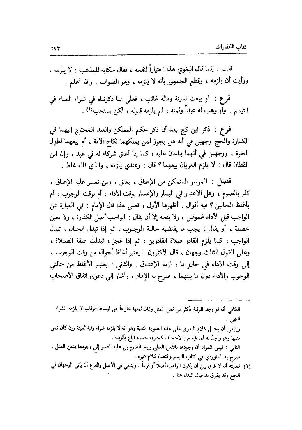 فصل الموسر المتمكن من الاعتاق، يعتق، ومن تعسر عليه الاعتاق، كفر بالصوم، وهل الاعتبار في اليسار والاعسار بوقت الاداء، أم بوقت الوجوب، أم بأغلظ الحالين ؟ فيه أقوال. أظهرها الاول، فعلى هذا قال الامام: في العبارة عن الواجب قبل الاداء غموض، ولا يتجه إلا أن يقال: الواجب أصل الكفارة، ولا يعين خصلة، أويقال: يجب ما يقتضيه حالة الوجوب، ثم إذا تبدل الحال، تبدل الواجب، كما يلزم القادر صلاة القادرين، ثم إذا عجز، تبدلت صفة الصلاة، وعلى القول الثالث وجهان، قال الاكثرون: يعتبر أغلظ أحواله من وقت الوجوب، إلى وقت الاداء في حال ما، لزمه الاعتاق. والثاني: يعتبر الاغلظ من حالتي الوجوب والاداء دون ما بينهما، صرح به الامام، وأشار إلى دعوى اتفاق الاصحاب