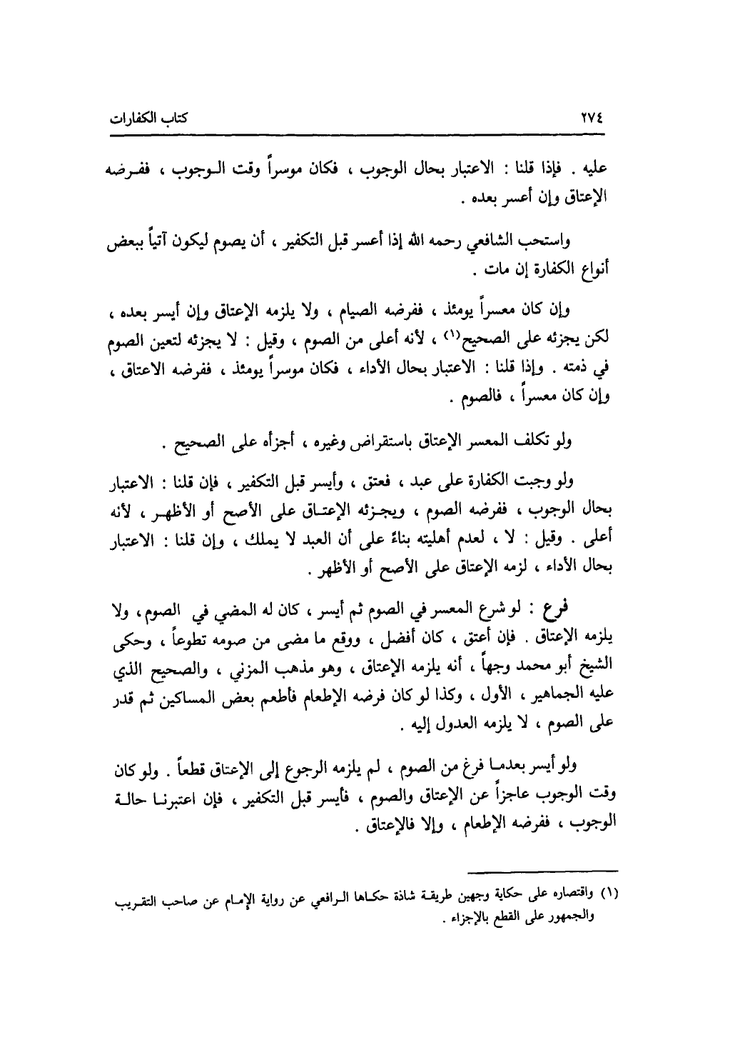 عليه. فإذا قلنا: الاعتبار بحال الوجوب، فكان موسرا وقت الوجوب، ففرضه الاعتاق وإن أعسر بعده. واستحب الشافعي رحمه الله إذا أعسر قبل التكفير، أن يصوم ليكون آتيا ببعض أنواع الكفارة إن مات. وإن كان معسرا يومئذ، ففرضه الصيام، ولا يلزمه الاعتاق وإن أيسر بعده، لكن يجزئه على الصحيح، لانه أعلى من الصوم، وقيل: لا يجزئه لتعين الصوم في ذمته. وإذا قلنا: الاعتبار بحال الاداء، فكان موسرا يومئذ، ففرضه الاعتاق، وإن كان معسرا، فالصوم. ولو تكلف المعسر الاعتاق باستقراض وغيره، أجزأه على الصحيح. ولو وجبت الكفارة على عبد، فعتق، وأيسر قبل التكفير، فإن قلنا: الاعتبار بحال الوجوب، ففرضه الصوم، ويجزئه الاعتاق على الاصح أو الاظهر، لانه أعلى. وقيل: لا، لعدم أهليته بناء على أن العبد لا يملك، وإن قلنا: الاعتبار بحال الاداء، لزمه الاعتاق على الاصح أو الاظهر. فرع لو شرع المعسر في الصوم ثم أيسر، كان له المضي في الصوم، ولا يلزمه الاعتاق. فإن أعتق، كان أفضل، ووقع ما مضى من صومه تطوعا، وحكى الشيخ أبو محمد وجها، أنه يلزمه الاعتاق، وهو مذهب المزني، والصحيح الذي عليه الجماهير، الاول، وكذا لو كان فرضه الاطعام فأطعم بعض المساكين ثم قدر على الصوم، لا يلزمه العدول إليه. ولو أيسر بعد ما فرغ من الصوم، لم يلزمه الرجوع إلى الاعتاق قطعا. ولو كان وقت الوجوب عاجزا عن الاعتاق والصوم، فأيسر قبل التكفير، فإن اعتبرنا حالة الوجوب، ففرضه الاطعام، وإلا فالاعتاق.