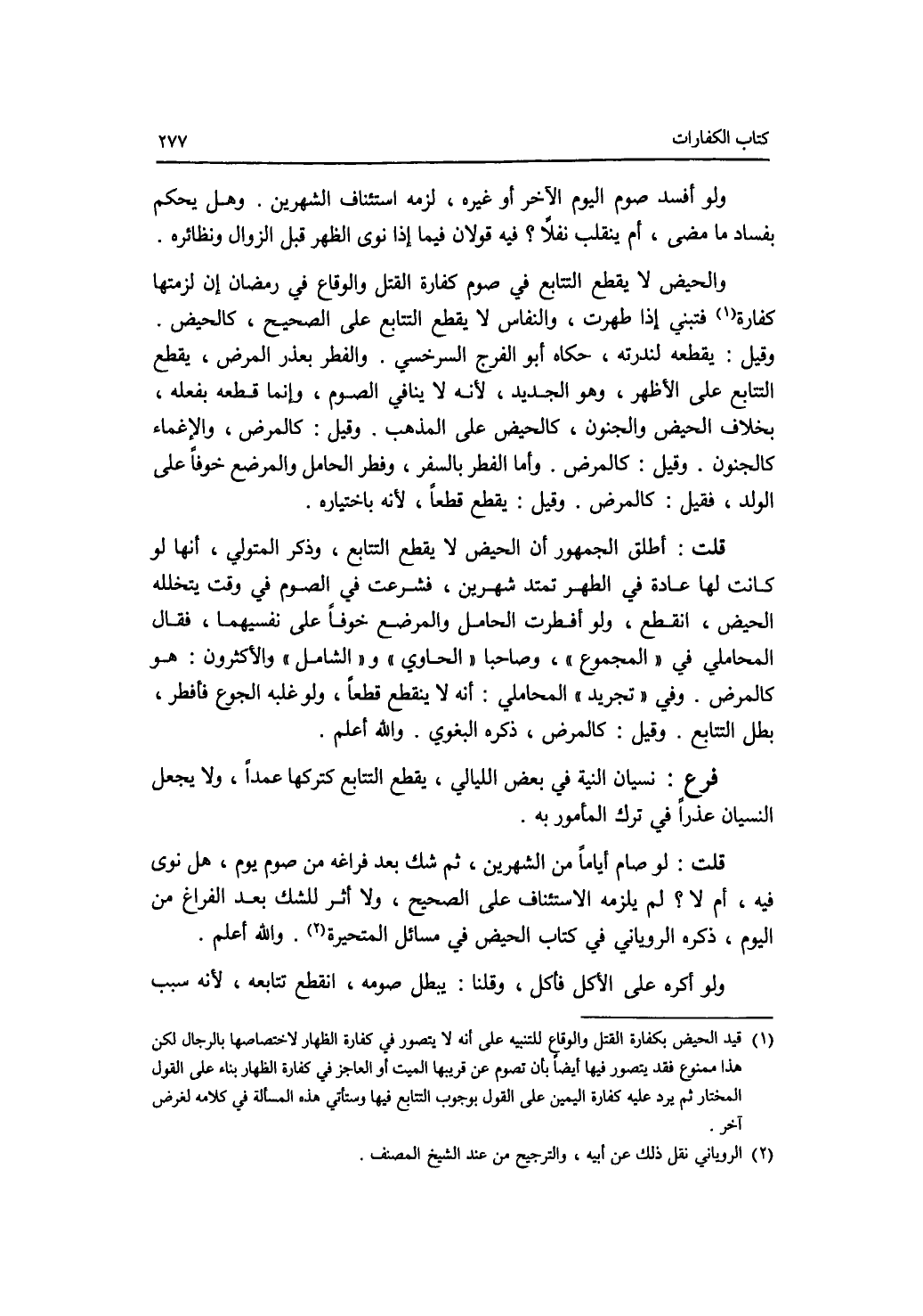 ولو أفسد صوم اليوم الآخر أو غيره، لزمه استئناف الشهرين. وهل يحكم بفساد ما مضى، أم ينقلب نفلا ؟ فيه قولان فيما إذا نوى الظهر قبل الزوال ونظائره. والحيض لا يقطع التتابع في صوم كفارة القتل والوقاع في رمضان إن لزمتها كفارة، فتبني إذا طهرت، والنفاس لا يقطع التتابع على الصحيح، كالحيض. وقيل: يقطعه لندرته، حكاه أبو الفرج السرخسي. والفطر بعذر المرض، يقطع التتابع على الاظهر، وهو الجديد، لانه لا ينافي الصوم، وإنما قطعه بفعله، بخلاف الحيض والجنون، كالحيض على المذهب. وقيل: كالمرض، والاغماء كالجنون. وقيل: كالمرض. وأما الفطر بالسفر، وفطر الحامل والمرضع خوفا على الولد، فقيل: كالمرض. وقيل: يقطع قطعا، لانه باختياره. قلت: أطلق الجمهور أن الحيض لا يقطع التتابع، وذكر المتولي، أنها لو كانت لها عادة في الطهر تمتد شهرين، فشرعت في الصوم في وقت يتخلله الحيض، انقطع، ولو أفطرت الحامل والمرضع خوفا في نفسيهما، فقال المحاملي في المجموع، وصاحبا الحاوي والشامل والاكثرون: هو كالمرض. وفي تجريد المحاملي: أنه لا ينقطع قطعا، ولو غلبه الجوع فأفطر، بطل التتابع. وقيل: كالمرض، ذكره البغوي. والله أعلم. فرع نسيان النية في بعض الليالي، يقطع التتابع كتركها عمدا، ولا يجعل النسيان عذرا في ترك المأمور به. قلت: لو صام أياما من الشهرين، ثم شك بعد فراغه من صوم يوم، هل نوى فيه، أم لا ؟ لم يلزمه الاستئناف على الصحيح، ولا أثر للشك بعد الفراغ من اليوم، ذكره الروياني في كتاب الحيض في مسائل المتحيرة. والله أعلم. ولو أكره على الاكل فأكل، وقلنا: يبطل صومه، انقطع تتابعه، لانه سبب