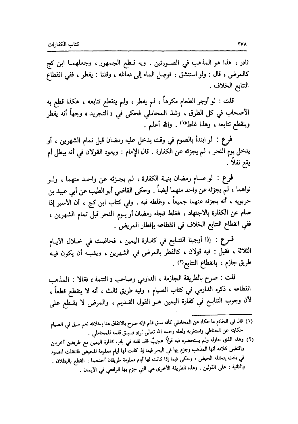 نادر، هذا هو المذهب في الصورتين، وبه قطع الجمهور، وجعلهما ابن كج كالمرض، قال: ولو استنشق، فوصل الماء إلى دماغه، وقلنا: يفطر، ففي انقطاع التتابع الخلاف. قلت: لو أوجر الطعام مكرها، لم يفطر، ولم ينقطع تتابعه، هكذا قطع به الاصحاب في كل الطرق، وشذ المحاملي فحكى في التجريد وجها أنه يفطر وينقطع تتابعه، وهذا غلط. والله أعلم. فرع لو ابتدأ بالصوم في وقت يدخل عليه رمضان قبل تمام الشهرين، أو يدخل يوم النحر، لم يجزئه عن الكفارة. قال الامام: ويعود القولان في أنه يبطل أم يقع نفلا. فرع لو صام رمضان بنية الكفارة، لم يجزئه عن واحد منهما، ولو نواهما، لم يجزئه عن واحد منهما أيضا. وحكى القاضي أبو الطيب عن أبي عبيد بن حربويه، أنه يجزئه عنهما جميعا، وغلطه فيه. وفي كتاب ابن كج، أن الاسير إذا صام عن الكفارة بالاجتهاد، فغلط فجاء رمضان أو يوم النحر قبل تمام الشهرين، ففي انقطاع التتابع الخلاف في انقطاعه بإفطار المريض. فرع إذا أوجبنا التتابع في كفارة اليمين، فحاضت في خلال الايام الثلاثة، فقيل: فيه قولان، كالفطر بالمرض في الشهرين، ويشبه أن يكون فيه طريق جازم، بانقطاع التتابع. قلت: صرح بالطريقة الجازمة، الدارمي وصاحب التتمة فقالا: المذهب انقطاعه، ذكره الدارمي في كتاب الصيام، وفيه طريق ثالث، أنه لا ينقطع قطعا، لان وجوب التتابع في كفارة اليمين هو القول القديم، والمرض لا يقطع على