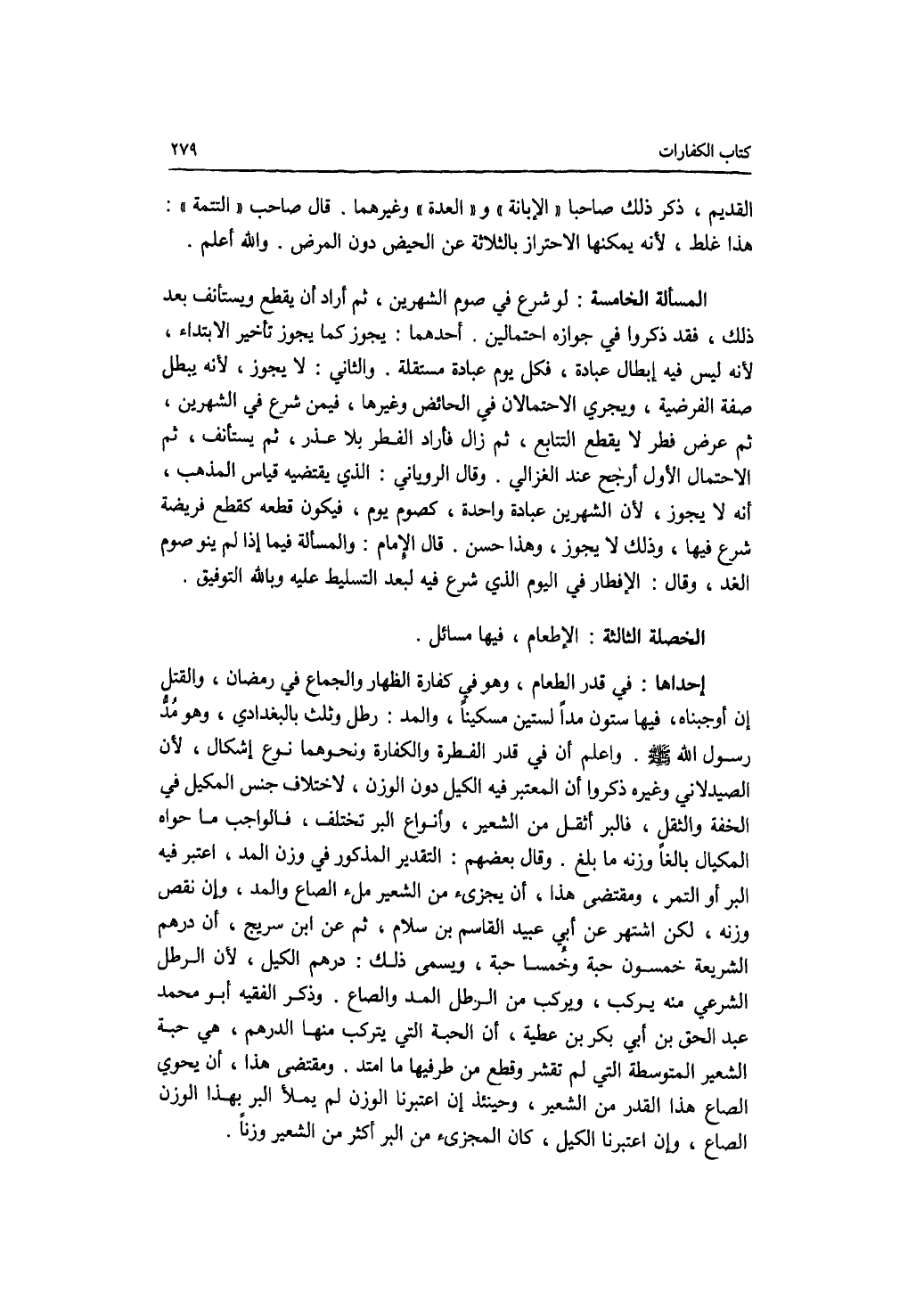 القديم، ذكر ذلك صاحبا الابانة والعدة وغيرهما. قال صاحب التتمة: هذا غلط، لانه يمكنها الاحتراز بالثلاثة عن الحيض دون المرض. والله أعلم. المسألة الخامسة: لو شرع في صوم الشهرين، ثم أراد أن يقطع ويستأنف بعد ذلك، فقد ذكروا في جوازه احتمالين. أحدهما: يجوز كما يجوز تأخير الابتداء، لانه ليس فيه إبطال عبادة، فكل يوم عبادة مستقلة. والثاني: لا يجوز، لانه يبطل صفة الفرضية، ويجري الاحتمالان في الحائض وغيرها، فيمن شرع في الشهرين، ثم عرض فطر لا يقطع التتابع، ثم زال فأراد الفطر بلا عذر، ثم يستأنف، ثم الاحتمال الاول أرجح عند الغزالي. وقال الروياني: الذي يقتضيه قياس المذهب، أنه لا يجوز، لان الشهرين عبادة واحدة، كصوم يوم، فيكون قطعه كقطع فريضة شرع فيها، وذلك لا يجوز، وهذا حسن. قال الامام: والمسألة فيما إذا لم ينو صوم الغد، وقال: الافطار في اليوم الذي شرع فيه لبعد التسليط عليه وبالله التوفيق. الخصلة الثالثة: الاطعام، فيها مسائل. إحداها: في قدر الطعام، وهو في كفارة الظهار والجماع في رمضان، والقتل إن أوجبناه، فيها ستون مدا لستين مسكينا، والمد: رطل وثلث بالبغدادي، وهو مد رسول الله - صلى الله عليه وسلم -. واعلم أن في قدر الفطرة والكفارة ونحوهما ونوع إشكال، لان الصيدلاني وغيره ذكروا أن المعتبر فيه الكيل دون الوزن، لاختلاف جنس المكيل في الخفة والثقل، فالبر أثقل من الشعير، وأنواع البر تختلف، فالواجب ما حواه المكيال بالغا وزنه ما بلغ. وقال بعضهم: التقدير المذكور في وزن المد، اعتبر فيه البر أو التمر، ومقتضى هذا، أن يجزئ من الشعير مل ء الصاع والمد، وإن نقص وزنه، لكن اشتهر عن أبي عبيد القاسم بن سلام، ثم عن ابن سريج، أن درهم الشريعة خمسون حبة وخمسا حبة، ويسمى ذلك: درهم الكيل، لان الرطل الشرعي منه يركب، ويركب من الرطل المد والصاع. وذكر الفقيه أبو محمد عبد الحق بن أبي بكر بن عطية، أن الحبة التي يتركب منها الدرهم، هي حبة الشعير المتوسطة التي لم تقشر وقطع من طرفيها ما امتد. ومقتضى هذا، أن يحوي الصاع هذا القدر من الشعير، وحينئذ إن اعتبرنا الوزن لم يملا البر بهذا الوزن الصاع، وإن اعتبرنا الكيل، كان المجزئ من البر أكثر من الشعير وزنا.