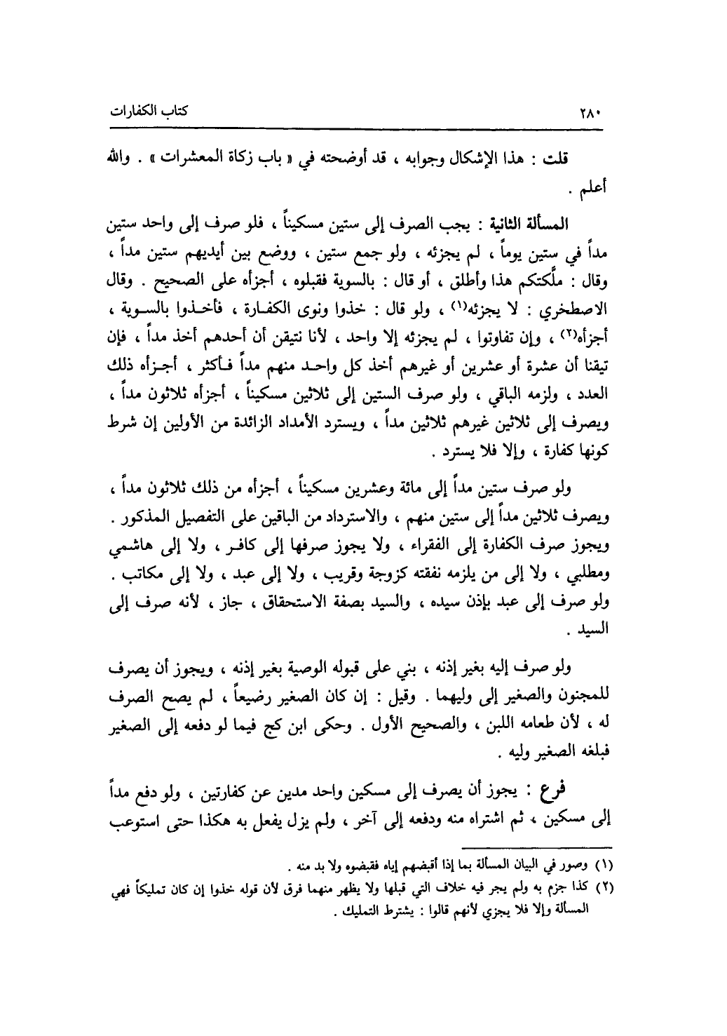 قلت: هذا الاشكال وجوابه، قد أوضحته في باب زكاة المعشرات. والله أعلم. المسألة الثانية: يجب الصرف إلى ستين مسكينا، فلو صرف إلى واحد ستين مدا في ستين يوما، لم يجزئه، ولو جمع ستين، ووضع بين أيديهم ستين مدا، وقال: ملكتكم هذا وأطلق، أو قال: بالسوية فقبلوه، أجزأه على الصحيح. وقال الاصطخري: لا يجزئه، ولو قال: خذوا ونوى الكفارة، فأخذوا بالسوية، أجزأه، وإن تفاوتوا، لم يجزئه إلا واحد، لانا نتيقن أن أحدهم أخذ مدا، فإن تيقنا أن عشرة أو عشرين أو غيرهم أخذ كل واحد منهم مدا فأكثر، أجزأه ذلك العدد، ولزمه الباقي، ولو صرف الستين إلى ثلاثين مسكينا، أجزأه ثلاثون مدا، ويصرف إلى ثلاثين غيرهم ثلاثين مدا، ويسترد الامداد الزائدة من الاولين إن شرط كونها كفارة، وإلا فلا يسترد. ولو صرف ستين مدا إلى مائة وعشرين مسكينا، أجزأه من ذلك ثلاثون مدا، ويصرف ثلاثين مدا إلى ستين منهم، والاسترداد من الباقين على التفصيل المذكور. ويجوز صرف الكفارة إلى الفقراء، ولا يجوز صرفها إلى كافر، ولا إلى هاشمي ومطلبي، ولا إلى من يلزمه نفقته كزوجة وقريب، ولا إلى عبد، ولا إلى مكاتب. ولو صرف إلى عبد بإذن سيده، والسيد بصفة الاستحقاق، جاز، لانه صرف إلى السيد. ولو صرف إليه بغير إذنه، بني على قبوله الوصية بغير إذنه، ويجوز أن يصرف للمجنون والصغير إلى وليهما. وقيل: إن كان الصغير رضيعا، لم يصح الصرف له، لان طعامه اللبن، والصحيح الاول. وحكى ابن كج فيما لو دفعه إلى الصغير فبلغه الصغير وليه. فرع يجوز أن يصرف إلى مسكين واحد مدين عن كفارتين، ولو دفع مدا إلى مسكين، ثم اشتراه منه ودفعه إلى آخر، ولم يزل يفعل به هكذا حتى استوعب
