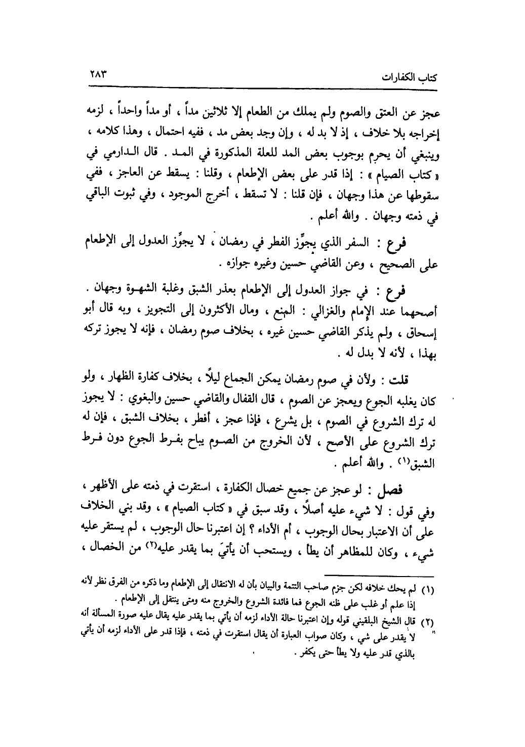 عجز عن العتق والصوم ولم يملك من الطعام إلا ثلاثين مدا، أو مدا واحدا، لزمه إخراجه بلا خلاف، إذ لا بد له، وإن وجد بعض مد، ففيه احتمال، هذا كلامه، وينبغي أن يجزم بوجوب بعض المد للعلة المذكورة في المد. قال الدارمي في كتاب الصيام: إذا قدر على بعض الاطعام، وقلنا: يسقط عن العاجز، ففي سقوطها عن هذا وجهان، فإن قلنا: لا تسقط، أخرج الموجود، وفي ثبوت الباقي في ذمته وجهان. والله أعلم. فرع السفر الذي يجوز الفطر في رمضان، لا يجوز العدول إلى الاطعام على الصحيح، وعن القاضي حسين وغيره جوازه. فرع في جواز العدول إلى الاطعام بعذر الشبق وغلبة الشهوة وجهان. أصحهما عند الامام والغزالي: المنع، ومال الاكثرون إلى التجويز، وبه قال أبو إسحق، ولم يذكر القاضي حسين غيره، بخلاف صوم رمضان، فإنه لا يجوز تركه بهذا، لانه لا بدل له. قلت: ولان في صوم رمضان يمكن الجماع ليلا، بخلاف كفارة الظهار، ولو كان يغلبه الجوع ويعجز عن الصوم، قال القفال والقاضي حسين والبغوي: لا يجوز له ترك الشروع في الصوم، بل يشرع، فإذا عجز، أفطر، بخلاف الشبق، فإن له ترك الشروع على الاصح، لان الخروج من الصوم يباح بفرط الجوع دون فرط الشبق. والله أعلم.
