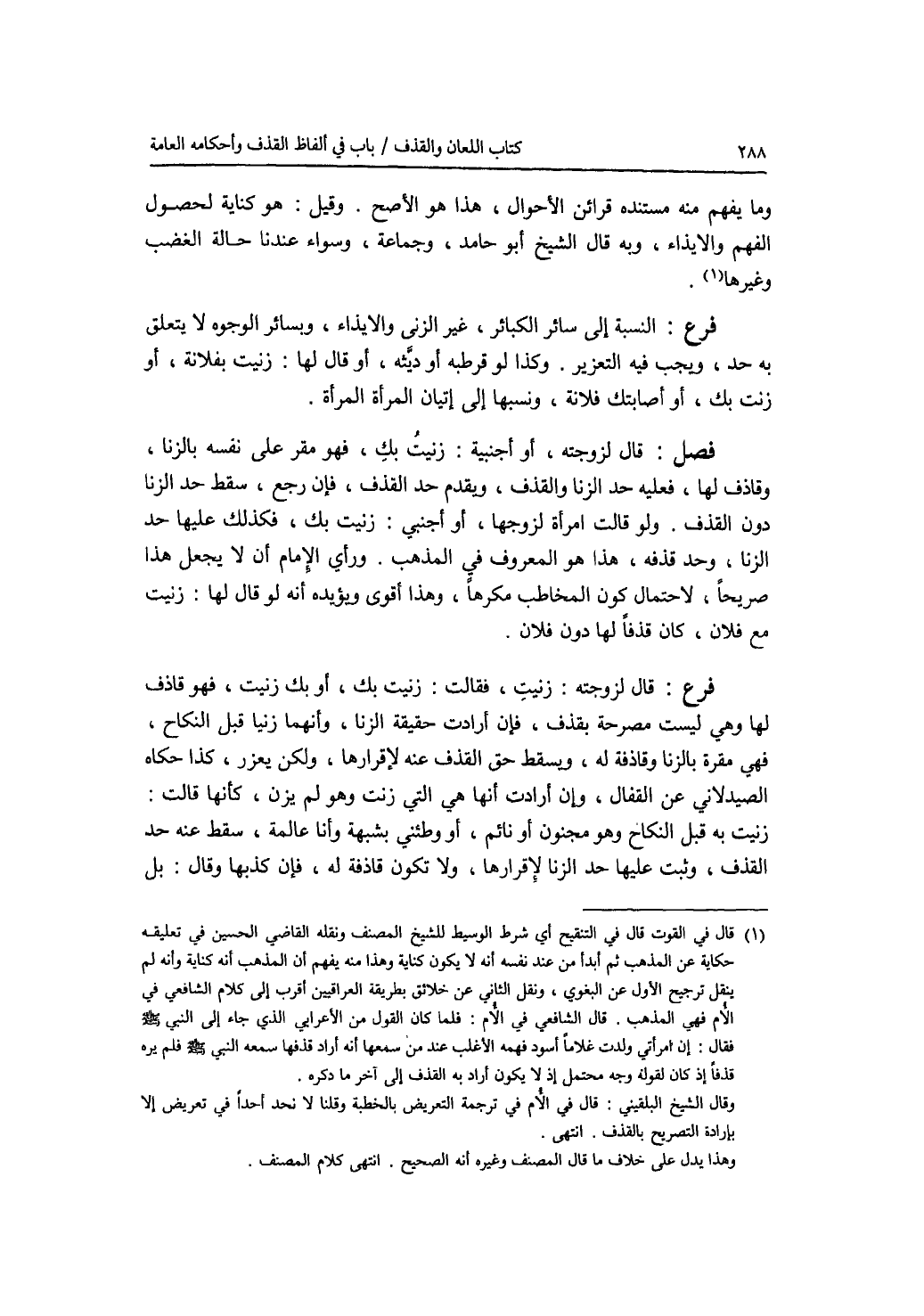 وما يفهم منه مستنده قرائن الاحوال، هذا هو الاصح. وقيل: هو كناية لحصول الفهم والايذاء، وبه قال الشيخ أبو حامد، وجماعة، وسواء عندنا حالة الغضب وغيرها. فرع النسبة إلى سائر الكبائر، غير الزنى والايذاء، وبسائر الوجوه لا يتعلق به حد، ويجب فيه التعزير. وكذا لو قرطبه أو ديثه، أو قال لها: زنيت بفلانة، أو زنت بك، أو أصابتك فلانة، ونسبها إلى إتيان المرأة المرأة. فصل قال لزوجته، أو أجنبية: زنيت بك، فهو مقر على نفسه بالزنا، وقاذف لها، فعليه حد الزنا والقذف، ويقدم حد القذف، فإن رجع، سقط حد الزنا دون القذف. ولو قالت إمرأة لزوجها، أو أجنبي: زنيت بك، فكذلك عليها حد الزنا، وحد قذفه، هذا هو المعروف في المذهب. ورأى الامام أن لا يجعل هذا صريحا، لاحتمال كون المخاطب مكرها، وهذا أقوى ويؤيده أنه لو قال لها: زنيت مع فلان، كان قذفا لها دون فلان. فرع قال لزوجته: زنيت، فقالت: زنيت بك، أو بك زنيت، فهو قاذف لها وهي ليست مصرحة بقذف، فإن أرادت حقيقة الزنا، وأنهما زنيا قبل النكاح، فهي مقرة بالزنا وقاذفة له، ويسقط حق القذف عنه لاقرارها، ولكن يعزر، كذا حكاه الصيدلاني عن القفال، وإن أرادت أنها هي التي زنت وهو لم يزن، كأنها قالت: زنيت به قبل النكاح وهو مجنون أو نائم، أو وطئني بشبهة وأنا عالمة، سقط عنه حد القذف، وثبت عليها حد الزنا لاقرارها، ولا تكون قاذفة له، فإن كذبها وقال: بل