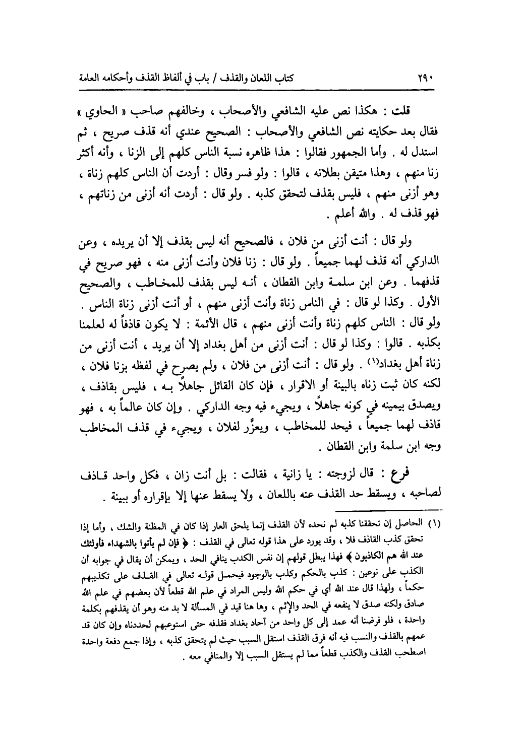 قلت: هكذا نص عليه الشافعي والاصحاب، وخالفهم صاحب الحاوي فقال بعد حكايته نص الشافعي والاصحاب: الصحيح عندي أنه قذف صريح، ثم استدل له. وأما الجمهور فقالوا: هذا ظاهره نسبة الناس كلهم إلى الزنا،، وأنه أكثر زنا منهم، وهذا متيقن بطلانه، قالوا: ولو فسر وقال: أردت أن الناس كلهم زناة، وهو أزنى منهم، فليس بقذف لتحقق كذبه. ولو قال: أردت أنه أزنى من زناتهم، فهو قذف له. والله أعلم. ولو قال: أنت أزنى من فلان، فالصحيح أنه ليس بقذف إلا أن يريده. وعن الداركي أنه قذف لهما جميعا. ولو قال: زنا فلان وأنت أزنى منه، فهو صريح في قذفهما. وعن ابن سلمة وابن القطان، أنه ليس بقذف للمخاطب، والصحيح الاول. وكذا لو قال: في الناس زناة وأنت أزنى منهم، أو أنت أزنى زناة الناس. ولو قال: الناس كلهم زناة وأنت أزنى منهم، قال الائمة: لا يكون قاذفا له لعلمنا بكذبه. قالوا: وكذا لو قال: أنت أزنى من أهل بغداد إلا أن يريد، أنت أزنى من زناة أهل بغداد. ولو قال: أنت أزنى من فلان، ولم يصرح في لفظه بزنا فلان، لكنه كان ثبت زناه بالبينة أو الاقرار، فإن كان القائل جاهلا به، فليس بقاذف، ويصدق بيمينه في كونه جاهلا، ويجئ فيه وجه الداركي. وإن كان عالما به، فهو قاذف لهما جميعا، فيحد للمخاطب، ويعزر لفلان، ويجئ في قذف المخاطب وجه ابن سلمة وابن القطان. فرع قال لزوجته: يا زانية، فقالت: بل أنت زان، فكل واحد قاذف لصاحبه، ويسقط حد القذف عنه باللعان، ولا يسقط عنها إلا بإقراره أو ببينة.