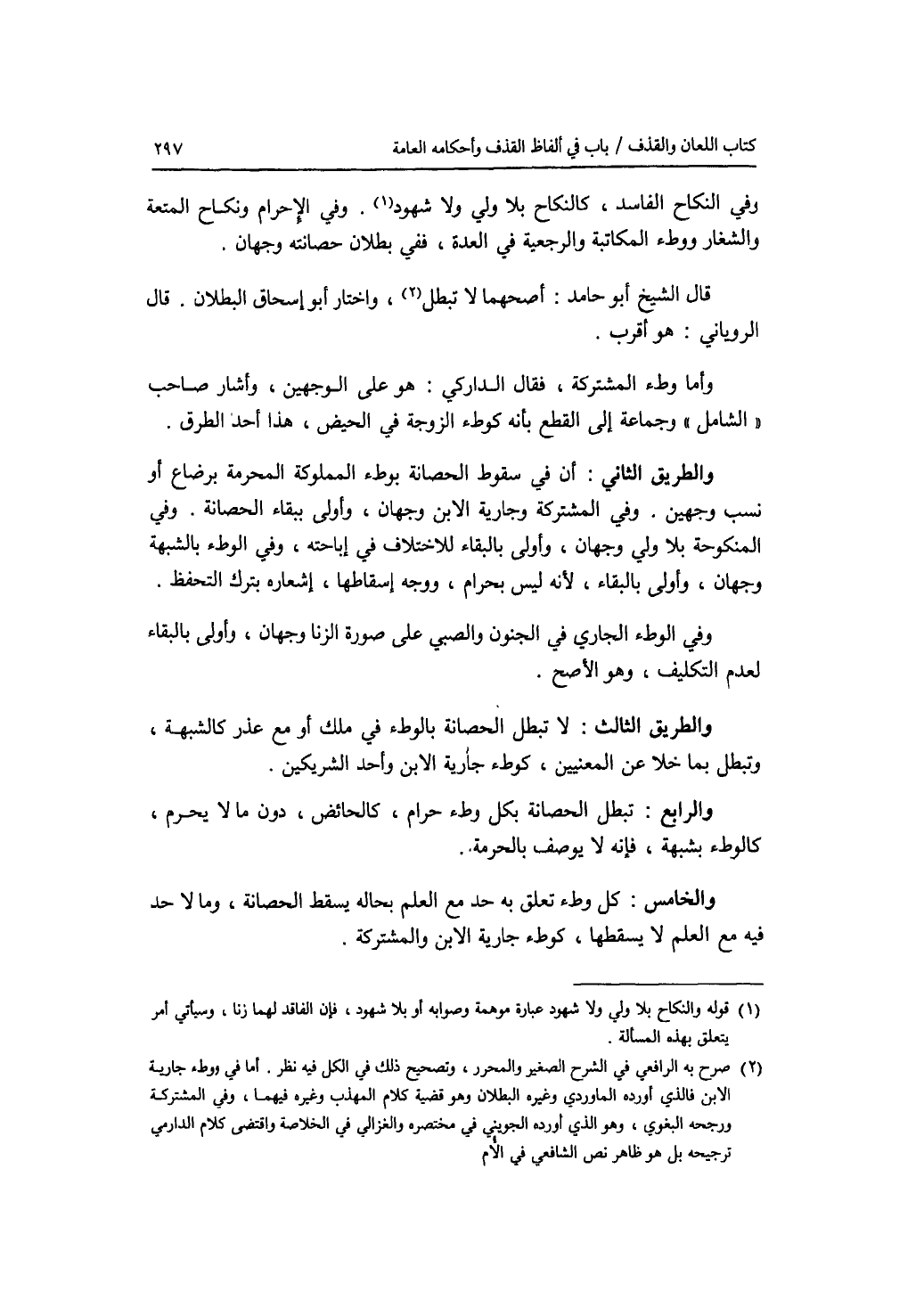 وفي النكاح الفاسد، كالنكاح بلا ولي ولا شهود. وفي الاحرام ونكاح المتعة والشغار ووطئ المكاتبة والرجعية في العدة، ففي بطلان حصانته وجهان. قال الشيخ أبو حامد: أصحهما لا تبطل، واختار أبو إسحق البطلان. قال الروياني: هو أقرب. وأما وطئ المشتركة، فقال الداركي: هو على الوجهين، وأشار صاحب الشامل وجماعة إلى القطع بأنه كوطئ الزوجة في الحيض، هذا أحد الطرق. والطريق الثاني: أن في سقوط الحصانة بوطئ المملوكة المحرمة برضاع أو نسب وجهين. وفي المشتركة وجارية الابن وجهان، وأولى ببقاء الحصانة. وفي المنكوحة بلا ولي وجهان، وأولى بالبقاء للاختلاف في إباحته، وفي الوطئ بالشبهة وجهان، وأولى بالبقاء، لانه ليس بحرام، ووجه إسقاطها، إشعاره بترك التحفظ. وفي الوطئ الجاري في الجنون والصبي على صورة الزنا وجهان، وأولى بالبقاء لعدم التكليف، وهو الاصح. والطريق الثالث: لا تبطل الحصانة بالوطئ في ملك أو مع عذر كالشبهة، وتبطل بما خلا عن المعنيين، كوطئ جارية الابن وأحد الشريكين. والرابع: تبطل الحصانة بكل وطئ حرام، كالحائض، دون ما لا يحرم، كالوطئ بشبهة، فإنه لا يوصف بالحرمة. والخامس: كل وطئ تعلق به حد مع العلم بحاله يسقط الحصانة، وما لا حد فيه مع العلم لا يسقطها، كوطئ جارية الابن والمشتركة.