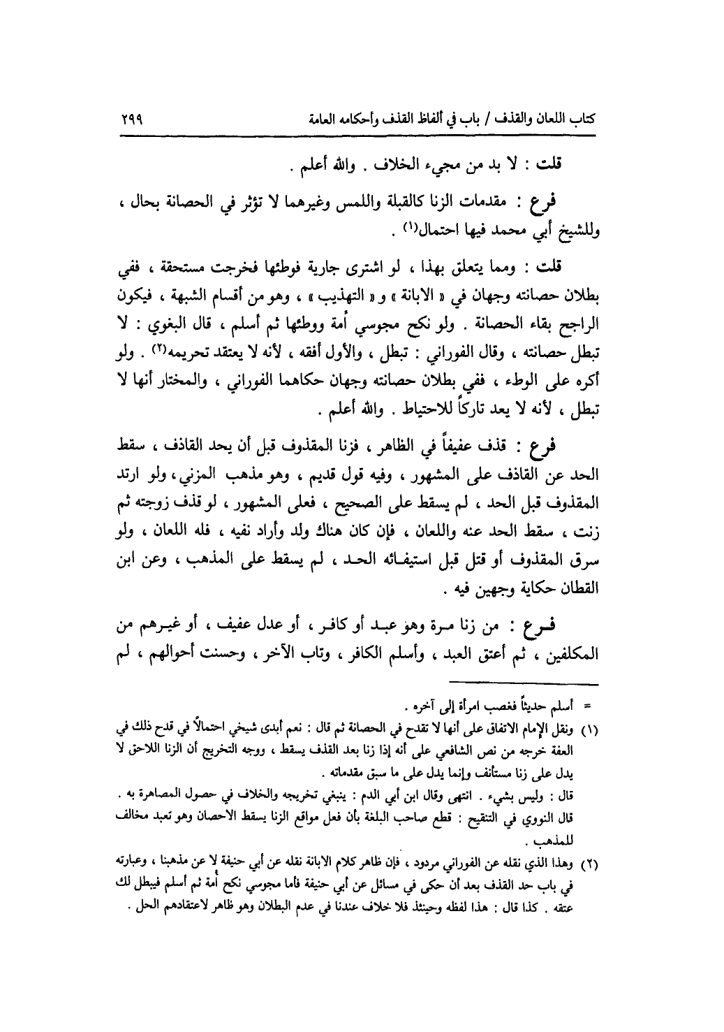 قلت: لا بد من مجئ الخلاف. والله أعلم. فرع مقدمات الزنا كالقبلة واللمس وغيرهما لا تؤثر في الحصانة بحال، وللشيخ أبي محمد فيها احتمال. قلت: ومما يتعلق بهذا، لو اشترى جارية فوطئها فخرجت مستحقة، ففي بطلان حصانته وجهان في الابانة والمهذب، وهو من أقسام الشبهة، فيكون الراجح بقاء الحصانة. ولو نكح مجوسي أمة ووطئها ثم أسلم، قال البغوي: لا تبطل حصانته، وقال الفوراني: تبطل، والاول أفقه، لانه لا يعتقد تحريمه. ولو أكره على الوطئ، ففي بطلان حصانته وجهان حكاهما الفوراني، والمختار أنها لا تبطل، لانه لا يعد تاركا للاحتياط. والله أعلم. فرع قذف عفيفا في الظاهر، فزنا المقذوف قبل أن يحد القاذف، سقط الحد عن القاذف على المشهور، وفيه قول قديم، وهو مذهب المزني، ولو ارتد المقذوف قبل الحد، لم يسقط على الصحيح، فعلى المشهور، لو قذف زوجته ثم زنت، سقط الحد عنه واللعان، فإن كان هناك ولد وأراد نفيه، فله اللعان، ولو سرق المقذوف أو قتل قبل استيفائه الحد، لم يسقط على المذهب، وعن ابن القطان حكاية وجهين فيه. فرع من زنا مرة وهو عبد أو كافر، أو عدل عفيف، أو غيرهم من المكلفين، ثم أعتق العبد، وأسلم الكافر، وتاب الآخر، وحسنت أحوالهم، لم