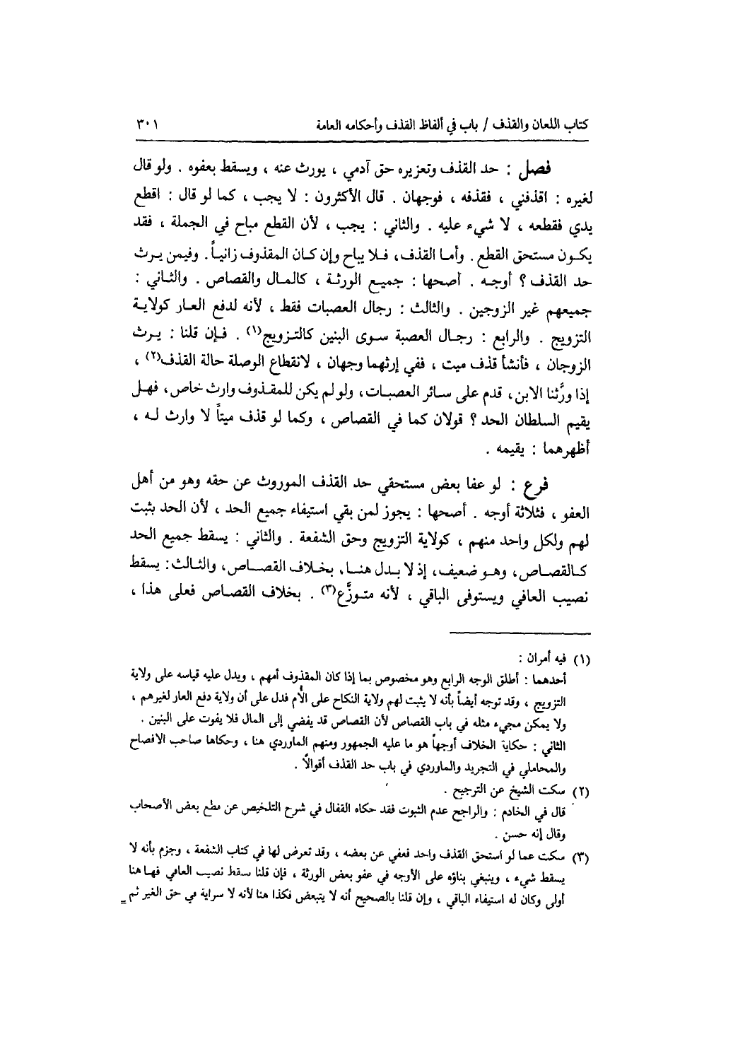 فصل حد القذف وتعزيره حق آدمي، يورث عنه، ويسقط بعفوه. ولو قال لغيره: اقذفني، فقذفه، فوجهان. قال الاكثرون: لا يجب، كما لو قال: اقطع يدي فقطعه، لا شئ عليه. والثاني: يجب، لان القطع مباح في الجملة، فقد يكون مستحق القطع. وأما القذف، فلا يباح وإن كان المقذوف زانيا. وفيمن يرث حد القذف ؟ أوجه. أصحها: جميع الورثة، كالمال والقصاص. والثاني: جميعهم غير الزوجين. والثالث: رجال العصبات فقط، لانه لدفع العار كولاية التزويج. والرابع: رجال العصبة سوى البنين كالتزويج. فإن قلنا: يرث الزوجان، فأنشأ قذف ميت، ففي إرثهما وجهان، لانقطاع الوصلة حالة القذف، و إذا ورثنا الابن، قدم على سائر العصبات، ولو لم يكن للمقذوف وارث خاص، فهل يقيم السلطان الحد ؟ قولان كما في القصاص، وكما لو قذف ميتا لا وارث له، أظهرهما: يقيمه. فرع لو عفا بعض مستحقي حد القذف الموروث عن حقه وهو من أهل العفو، فثلاثة أوجه. أصحها: يجوز لمن بقي استيفاء جميع الحد، لان الحد يثبت لهم ولكل واحد منهم، كولاية التزويج وحق الشفعة. والثاني: يسقط جميع الحد كالقصاص، وهو ضعيف، إذ لا بدل هنا، بخلاف القصاص، والثالث: يسقط نصيب العافي ويستوفي الباقي، لانه متوزع، بخلاف القصاص فعلى هذا،