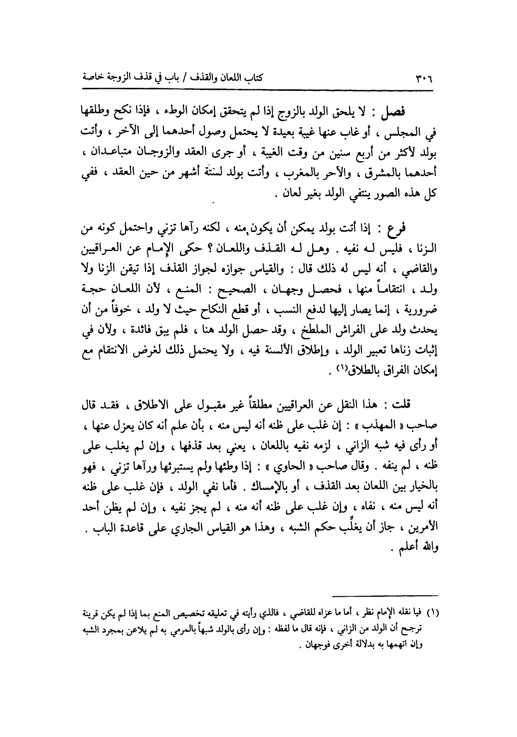 فصل لا يلحق الولد بالزوج إذا لم يتحقق إمكان الوطئ، فإذا نكح وطلقها في المجلس، أو غاب عنها غيبة بعيدة لا يحتمل وصول أحدهما إلى الآخر، وأتت بولد لاكثر من أربع سنين من وقت الغيبة، أو جرى العقد والزوجان متباعدان، أحدهما بالمشرق، والآخر بالمغرب، وأتت بولد لستة أشهر من حين العقد، ففي كل هذه الصور ينتفي الولد بغير لعان. فرع إذا أتت بولد يمكن أن يكون منه، لكنه رآها تزني واحتمل كونه من الزنا، فليس له نفيه. وهل له القذف واللعان ؟ حكى الامام عن العراقيين والقاضي، أنه ليس له ذلك قال: والقياس جوازه لجواز القذف إذا تيقن الزنا ولا ولد، انتقاما منها، فحصل وجهان، الصحيح: المنع، لان اللعان حجة ضرورية، إنما يصار إليها لدفع النسب، أو قطع النكاح حيث لا ولد، خوفا من أن يحدث ولد على الفراش الملطخ، وقد حصل الولد هنا، فلم يبق فائدة، ولان في إثبات زناها تعيير الولد، وإطلاق الالسنة فيه، ولا يحتمل ذلك لغرض الانتقام مع إمكان الفراق بالطلاق. قلت: هذا النقل عن العراقيين مطلقا غير مقبول على الاطلاق، فقد قال صاحب المهذب: إن غلب على ظنه أنه ليس منه، بأن علم أنه كان يعزل عنها، أو رأى فيه شبه الزاني، لزمه نفيه باللعان، يعني بعد قذفها، وإن لم يغلب على ظنه، لم ينفه. وقال صاحب الحاوي: إذا وطئها ولم يستبرئها ورآها تزني، فهو بالخيار بين اللعان بعد القذف، أو بالامساك. فأما نفي الولد، فإن غلب على ظنه أنه ليس منه، نفاه، وإن غلب على ظنه أنه منه، لم يجز نفيه، وإن لم يظن أحد الامرين، جاز أن يغلب حكم الشبه، وهذا هو القياس الجاري على قاعدة الباب. والله أعلم.