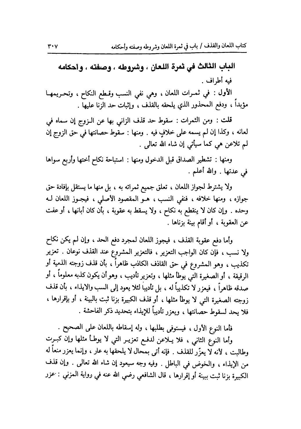 الأول : في ثمرات اللعان، وهي نفي النسب وقطع النكاح، وتحريمها مؤبدا، ودفع المحذور الذي يلحقه بالقذف، وإثبات حد الزنا عليها. قلت: ومن الثمرات: سقوط حد قذف الزاني بها عن الزوج إن سماه في لعانه، وكذا إن لم يسمه على خلاف فيه. ومنها: سقوط حصانتها في حق الزوج إن لم تلاعن هي كما سيأتي إن شاء الله تعالى. ومنها: تشطير الصداق قبل الدخول. ومنها: استباحة نكاح أختها وأربع سواها في عدتها. والله أعلم. ولا يشترط لجواز اللعان، تعلق جميع ثمراته به، بل منها ما يستقل بإفادة حق جوازه، ومنها خلافه، فنفي النسب، هو المقصود الاصلي، فيجوز اللعان له وحده. وإن كان لا ينقطع به نكاح، ولا يسقط به عقوبة، بأن كان أبانها، أو عفت عن العقوبة، أو أقام بينة بزناها. وأما دفع عقوبة القذف، فيجوز اللعان لمجرد دفع الحد، وإن لم يكن نكاح ولا نسب، فإن كان الواجب التعزير، فالتعزير المشروع عند القذف نوعان. تعزير تكذيب، وهو المشروع في حق القاذف الكاذب ظاهرا، بأن قذف زوجته الذمية أو الرقيقة، أو الصغيرة التي يوطأ مثلها، وتعزير تأديب، وهو أن يكون كذبه معلوما، أو صدقه ظاهرا، فيعزر لا تكذيبا له، بل تأديبا لئلا يعود إلى السب والايذاء، بأن قذف زوجته الصغيرة التي لا يوطأ مثلها، أو قذف الكبيرة بزنا ثبت بالبينة، أو بإقرارها، فلا يحد لسقوط حصانتها، ويعزر تأديبا للايذاء بتحديد ذكر الفاحشة. فأما النوع الاول، فيستوفى بطلبها، وله إسقاطه باللعان على الصحيح. وأما النوع الثاني، فلا يلاعن لدفع تعزير التي لا يوطأ مثلها وإن كبرت وطالبت، لانه لا يعزر للقذف. فإنه أتى بمحال لا يلحقها به عار، وإنما يعزر منعا له من الايذاء، والخوض في الباطل. وفيه وجه سيعود إن شاء الله تعالى. وإن قذف الكبيرة بزنا ثبت ببينة أو إقرارها، قال الشافعي رضي الله عنه في رواية المزني: عزر