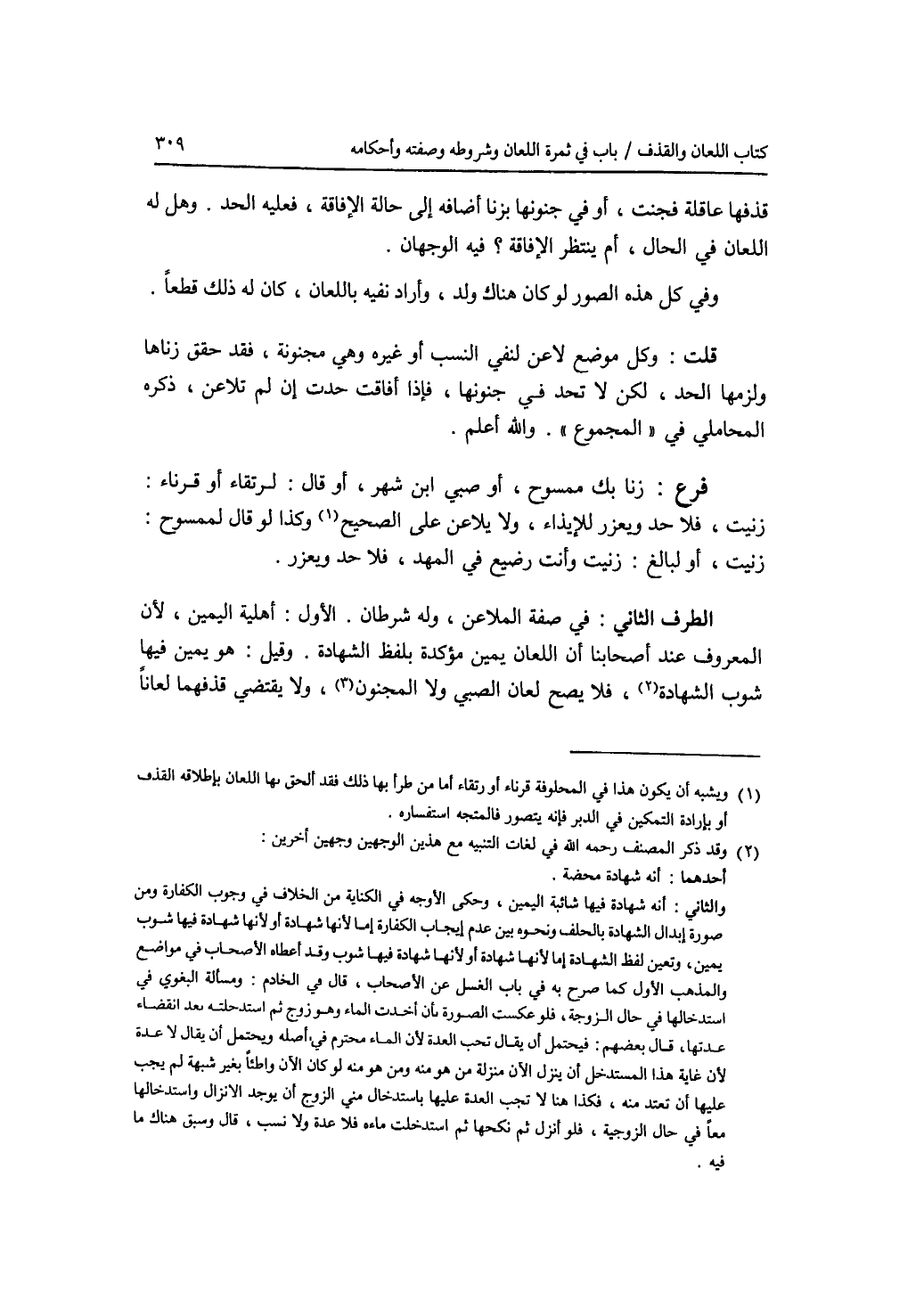 قذفها عاقلة فجنت، أو في جنونها بزنا أضافه إلى حالة الافاقة، فعليه الحد. وهل له اللعان في الحال، أم ينتظر الافاقة ؟ فيه الوجهان. وفي كل هذه الصور لو كان هناك ولد، وأراد نفيه باللعان، كان له ذلك قطعا. قلت: وكل موضع لاعن لنفي النسب أو غيره وهي مجنونة، فقد حقق زناها ولزمها الحد، لكن لا تحد في جنونها، فإذا أفاقت حدت إن لم تلاعن، ذكره المحاملي في المجموع. والله أعلم. فرع زنا بك ممسوح، أو صبي ابن شهر، أو قال لرتقاء أو قرناء: زنيت، فلا حد ويعزر للايذاء، ولا يلاعن على الصحيح، وكذا لو قال لممسوح: زنيت، أو لبالغ: زنيت وأنت رضيع في المهد، فلا حد ويعزر.