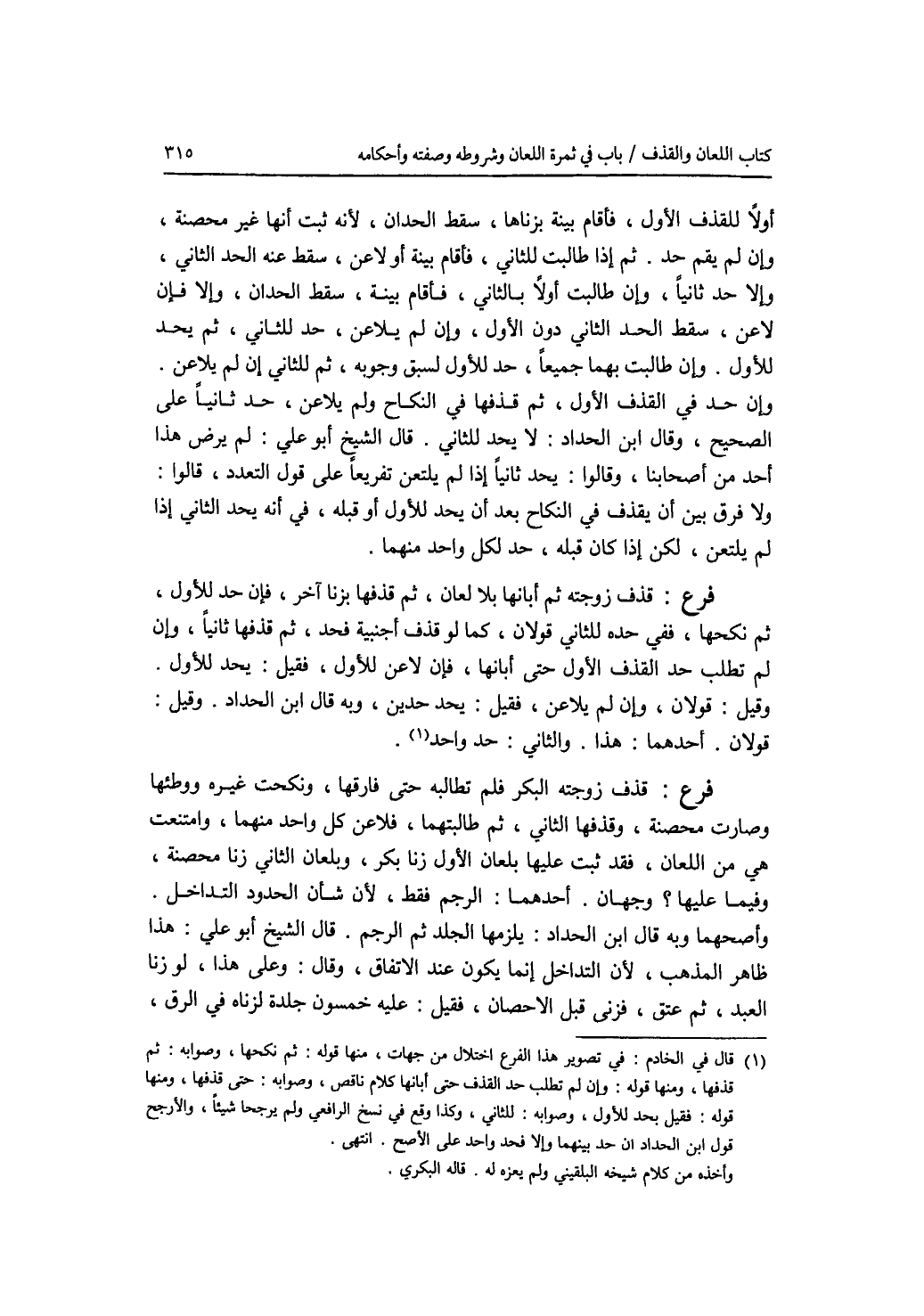 أولا للقذف الاول، فأقام بينة بزناها، سقط الحدان، لانه ثبت أنها غير محصنة، وإن لم يقم حد. ثم إذا طالبت للثاني، فأقام بينة أو لاعن، سقط عنه الحد الثاني، وإلا حد ثانيا، وإن طالبت أولا بالثاني، فأقام بينة، سقط الحدان، وإلا فإن لاعن، سقط الحد الثاني دون الاول، وإن لم يلاعن، حد للثاني، ثم يجد للاول. وإن طالبت بهما جميعا، حد للاول لسبق وجوبه، ثم للثاني إن لم يلاعن. وإن حد في القذف الاول، ثم قذفها في النكاح ولم يلاعن، حد ثانيا على الصحيح، وقال ابن الحداد: لا يحد للثاني. قال الشيخ أبو علي: لم يرض هذا أحد من أصحابنا، وقالوا: يحد ثانيا إذا لم يلتعن تفريعا على قول التعدد، قالوا: ولا فرق بين أن يقذف في النكاح بعد أن يحد للاول أو قبله، في أنه يحد الثاني إذا لم يلتعن، لكن إذا كان قبله، حد لكل واحد منهما. فرع قذف زوجته ثم أبانها بلا لعان، ثم قذفها بزنا آخر، فإن حد للاول، ثم نكحها، ففي حده للثاني قولان، كما لو قذف أجنبية فحد، ثم قذفها ثانيا، وإن لم تطلب حد القذف الاول حتى أبانها، فإن لاعن للاول، فقيل: يحد للاول. وقيل: قولان، وإن لم يلاعن، فقيل: يحد حدين، وبه قال ابن الحداد. وقيل: قولان. أحدهما: هذا. والثاني: حد واحد. فرع قذف زوجته البكر فلم تطالبه حتى فارقها، ونكحت غيره ووطئها وصارت محصنة، وقذفها الثاني، ثم طالبتهما، فلاعن كل واحد منهما، وامتنعت هي من اللعان، فقد ثبت عليها بلعان الاول زنا بكر، وبلعان الثاني زنا محصنة، وفيما عليها ؟ وجهان. أحدهما: الرجم فقط، لان شأن الحدود التداخل. وأصحهما وبه قال ابن الحداد: يلزمها الجلد ثم الرجم. قال الشيخ أبو علي: هذا ظاهر المذهب، لان التداخل إنما يكون عند الاتفاق، وقال: وعلى هذا، لو زنا العبد، ثم عتق، فزنى قبل الاحصان، فقيل: عليه خمسون جلدة لزناه في الرق،
