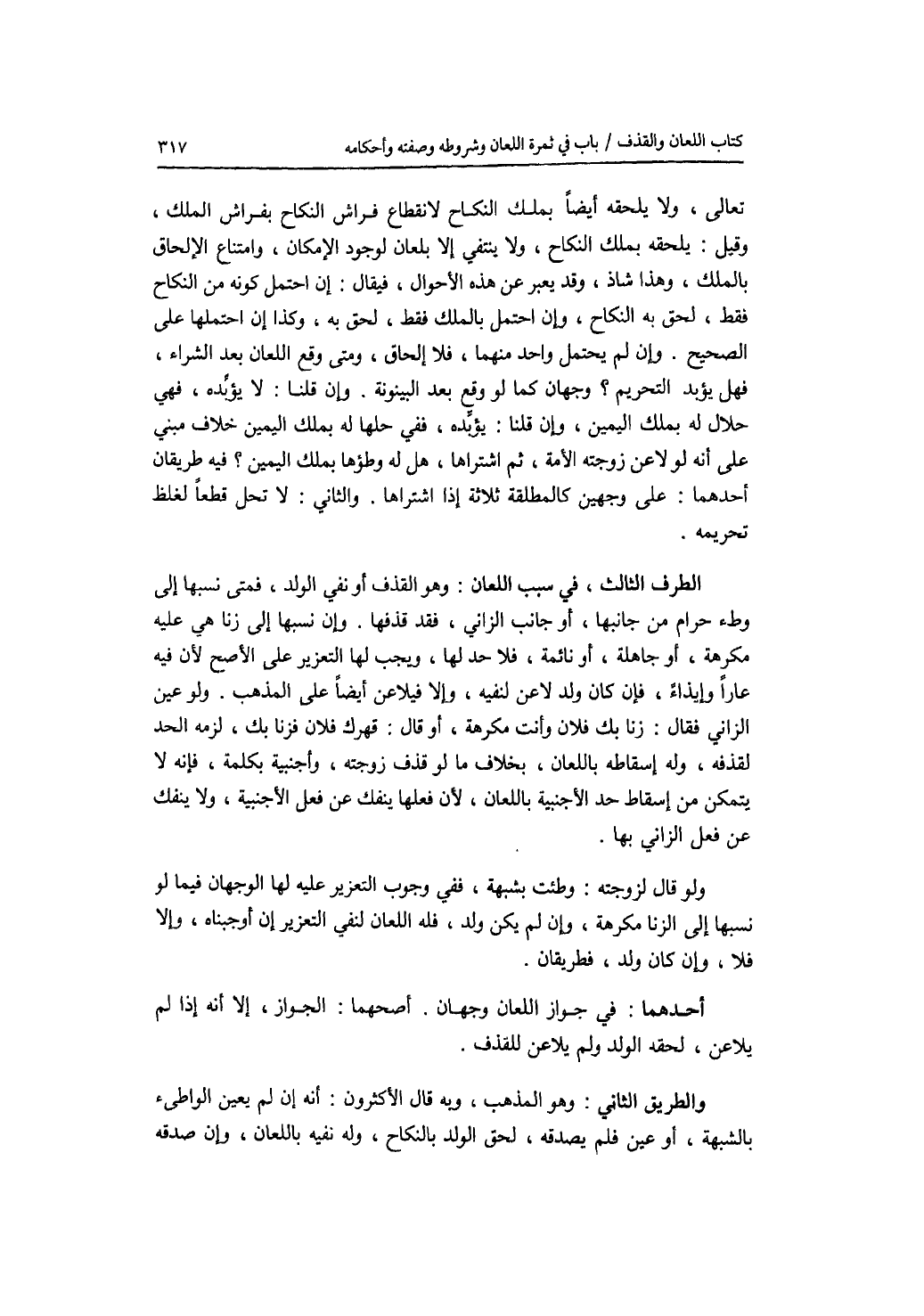 الطرف الثالث : في سبب اللعان وهو القذف أو نفي الولد، فمتى نسبها إلى وطئ حرام من جانبها، أو جانب الزاني، فقد قذفها. وإن نسبها إلى زنا هي عليه مكرهة، أو جاهلة، أو نائمة، فلا حد لها، ويجب لها التعزير على الاصح لان فيه عارا وإيذاء، فإن كان ولد لاعن لنفيه، وإلا فيلاعن أيضا على المذهب. ولو عين الزاني فقال: زنا بك فلان وأنت مكرهة، أو قال: قهرك فلان فزنا بك، لزمه الحد لقذفه، وله إسقاطه باللعان، بخلاف ما لو قذف زوجته، وأجنبية بكلمة، فإنه لا يتمكن من إسقاط حد الاجنبية باللعان، لان فعلها ينفك عن فعل الاجنبية، ولا ينفك عن فعل الزاني بها. ولو قال لزوجته: وطئت بشبهة، ففي وجوب التعزير عليه لها الوجهان فيما لو نسبها إلى الزنا مكرهة، وإن لم يكن ولد، فله اللعان لنفي التعزير إن أوجبناه، وإلا فلا، وإن كان ولد، فطريقان. أحدهما: في جواز اللعان وجهان. أصحها: الجواز، إلا أنه إذا لم يلاعن، لحقه الولد ولم يلاعن للقذف. والطريق الثاني: وهو المذهب، وبه قال الاكثرون: أنه إن لم يعين الواطئ بالشبهة، أو عين فلم يصدقه، لحق الولد بالنكاح، وله نفيه باللعان، وإن صدقه