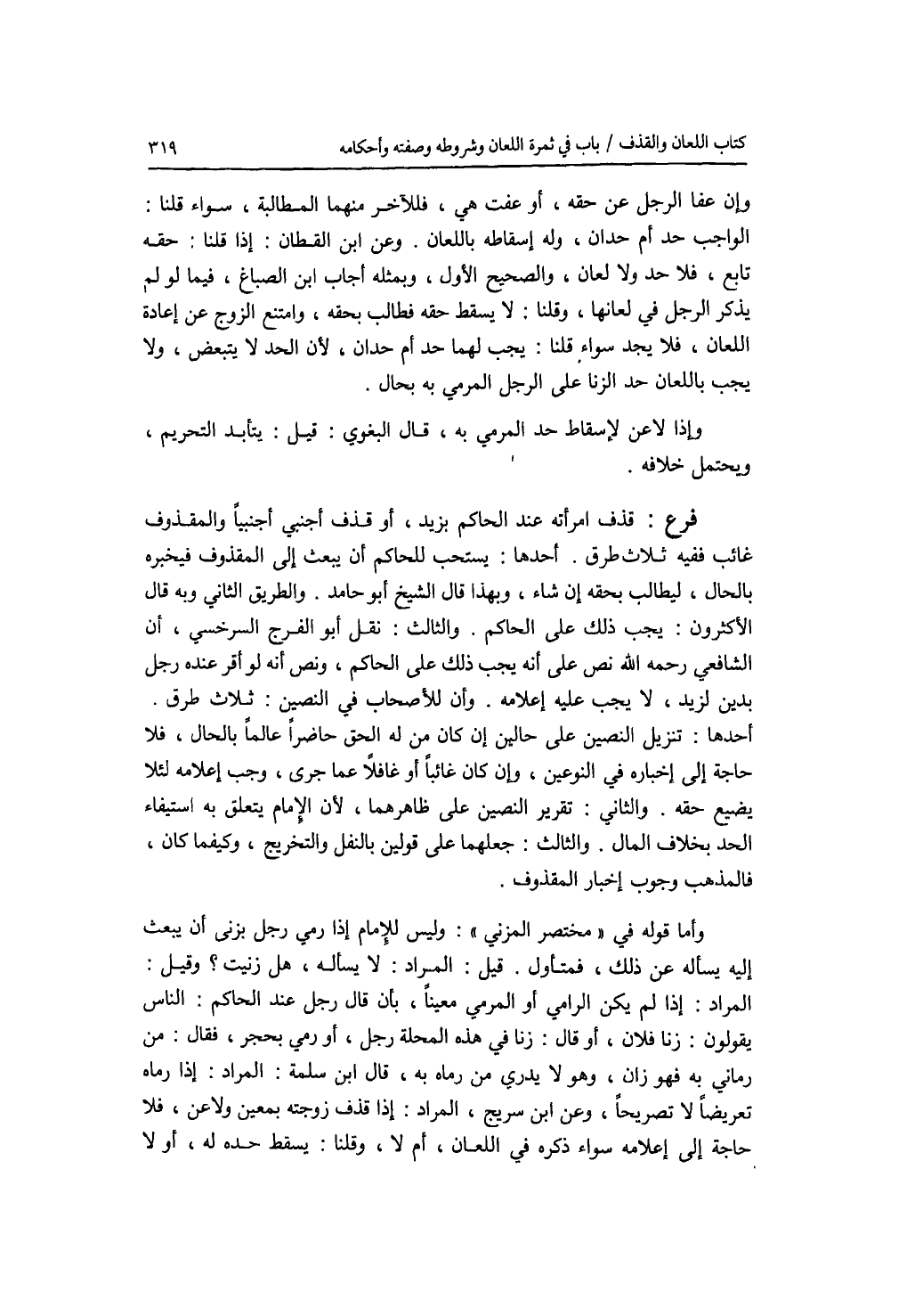 وإن عفا الرجل عن حقه، أو عفت هي، فللآخر منهما المطالبة، سواء قلنا: الواجب حد أم حدان، وله إسقاطه باللعان. وعن ابن القطان: إذا قلنا: حقه تابع، فلا حد ولا لعان، والصحيح الاول، وبمثله أجاب ابن الصباغ، فيما لو لم يذكر الرجل في لعانها، وقلنا: لا يسقط حقه فطالب بحقه، وامتنع الزوج عن إعادة اللعان، فلا يجد سواء قلنا: يجب لهما حد أم حدان، لان الحد لا يتبعض، ولا يجب باللعان حد الزنا على الرجل المرمي به بحال. وإذا لاعن لاسقاط حد المرمي به، قال البغوي: قيل: يتأبد التحريم، ويحتمل خلافه. فرع قذف إمرأته عند الحاكم بزيد، أو قذف أجنبي أجنبيا والمقذوف غائب ففيه ثلاث طرق. أحدها: يستحب للحاكم أن يبعث إلى المقذوف فيخبره بالحال، ليطالب بحقه إن شاء، وبهذا قال الشيخ أبو حامد. والطريق الثاني وبه قال الاكثرون: يجب ذلك على الحاكم. والثالث: نقل أبو الفرج السرخسي، أن الشافعي رحمه الله نص على أنه يجب ذلك على الحاكم، ونص أنه لو أقر عنده رجل بدين لزيد، لا يجب عليه إعلامه. وأن للاصحاب في النصين: ثلاث طرق. أحدها: تنزيل النصين على حالين إن كان من له الحق حاضرا عالما بالحال، فلا حاجة إلى إخباره في النوعين، وإن كان غائبا أو غافلا عما جرى، وجب إعلامه لئلا يضيع حقه. والثاني: تقرير النصين على ظاهرهما، لان الامام يتعلق به استيفاء الحد بخلاف المال. والثالث: جعلهما على قولين بالنفل والتخريج، وكيفما كان، فالمذهب وجوب إخبار المقذوف. وأما قوله في مختصر المزني: وليس للامام إذا رمي رجل بزنى أن يبعث إليه يسأله عن ذلك، فمتأول. قيل: المراد: لا يسأله، هل زنيت ؟ وقيل: المراد: إذا لم يكن الرامي أو المرمي معينا، بأن قال رجل عند الحاكم: الناس يقولون: زنا فلان، أو قال: زنا في هذه المحلة رجل، أو رمى بحجر، فقال: من رماني به فهو زان، وهو لا يدري من رماه به. قال ابن سلمة: المراد: إذا رماه تعريضا لا تصريحا، وعن ابن سريج، المراد: إذا قذف زوجته بمعين ولاعن، فلا حاجة إلى إعلامه سواء ذكره في اللعان، أم لا، وقلنا: يسقط حده له، أو لا