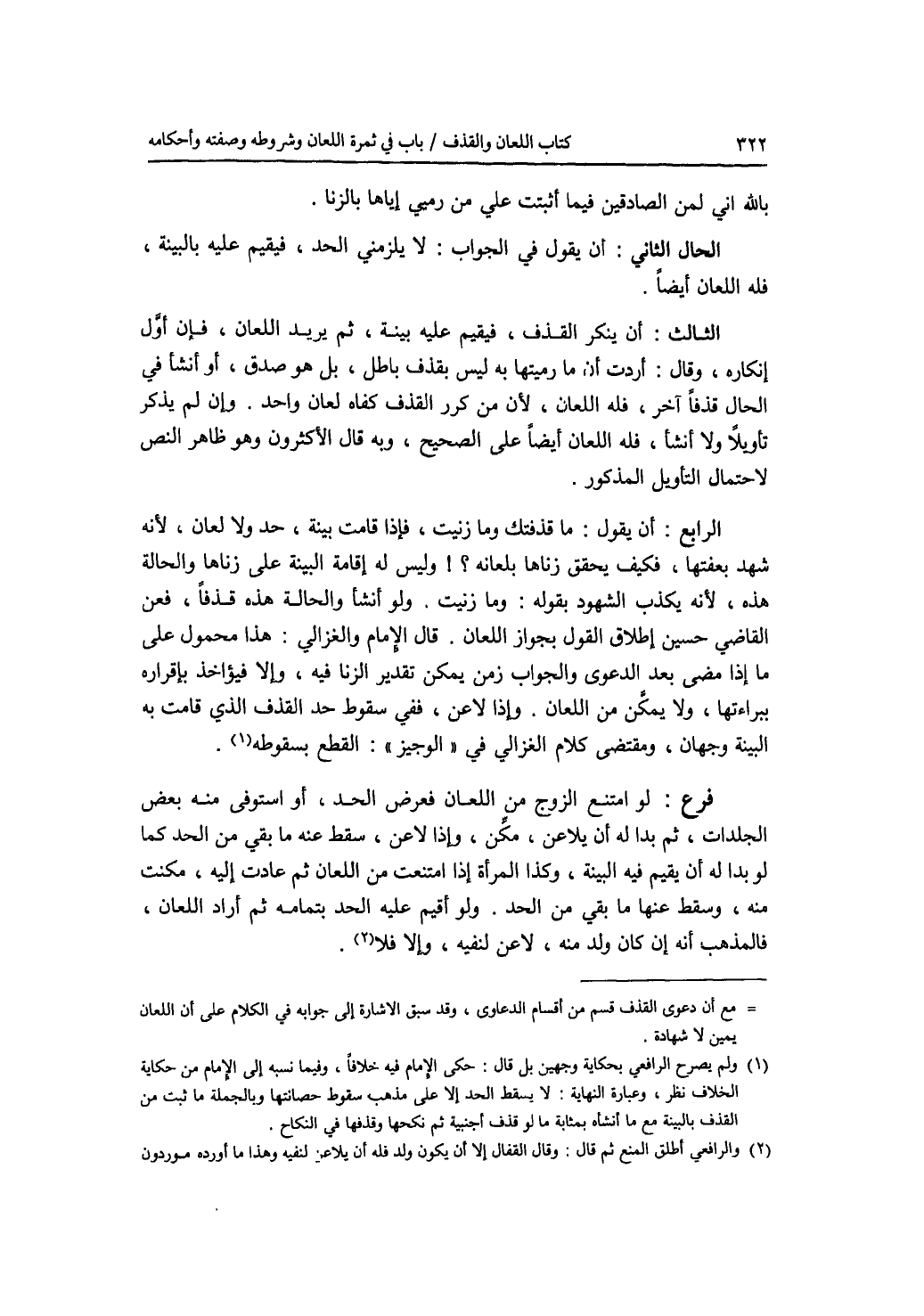 بالله إني لمن الصادقين فيما أثبتت علي من رميي إياها بالزنا. الحال الثاني: أن يقول في الجواب: لا يلزمني الحد، فيقيم عليه بالبينة، فله اللعان أيضا. الثالث: أن ينكر القذف، فيقيم عليه بينة، ثم يريد اللعان، فإن أول إنكاره، وقال: أردت أن ما رميتها به ليس بقذف باطل، بل هو صدق، أو أنشأ في الحال قذفا آخر، فله اللعان، لان من كرر القذف كفاه لعان واحد. وإن لم يذكر تأويلا ولا أنشأ، فله اللعان أيضا على الصحيح، وبه قال الاكثرون وهو ظاهر النص لاحتمال التأويل المذكور. الرابع: أن يقول: ما قذفتك وما زنيت، فإذا قامت بينة، حد ولا لعان، لانه شهد بعفتها، فكيف يحقق زناها بلعانه ؟ ! وليس له إقامة البينة على زناها والحالة هذه، لانه يكذب الشهود بقوله: وما زنيت. ولو أنشأ والحالة هذه قذفا، فعن القاضي حسين إطلاق القول بجواز اللعان. قال الامام والغزالي: هذا محمول على ما إذا مضى بعد الدعوى والجواب زمن يمكن تقدير الزنا فيه، وإلا فيؤاخذ بإقراره ببراءتها، ولا يمكن من اللعان. وإذا لاعن، ففي سقوط حد القذف الذي قامت به البينة وجهان، ومقتضى كلام الغزالي في الوجيز: القطع بسقوطه. فرع لو امتنع الزوج من اللعان فعرض الحد، أو استوفى منه بعض الجلدات، ثم بدا له أن يلاعن، مكن، وإذا لاعن، سقط عنه ما بقي من الحد كما لو بدا له أن يقيم فيه البينة، وكذا المرأة إذا امتنعت من اللعان ثم عادت إليه، مكنت منه، وسقط عنها ما بقي من الحد. ولو أقيم عليه الحد بتمامه ثم أراد اللعان، فالمذهب أنه إن كان ولد منه، لاعن لنفيه، وإلا فلا.