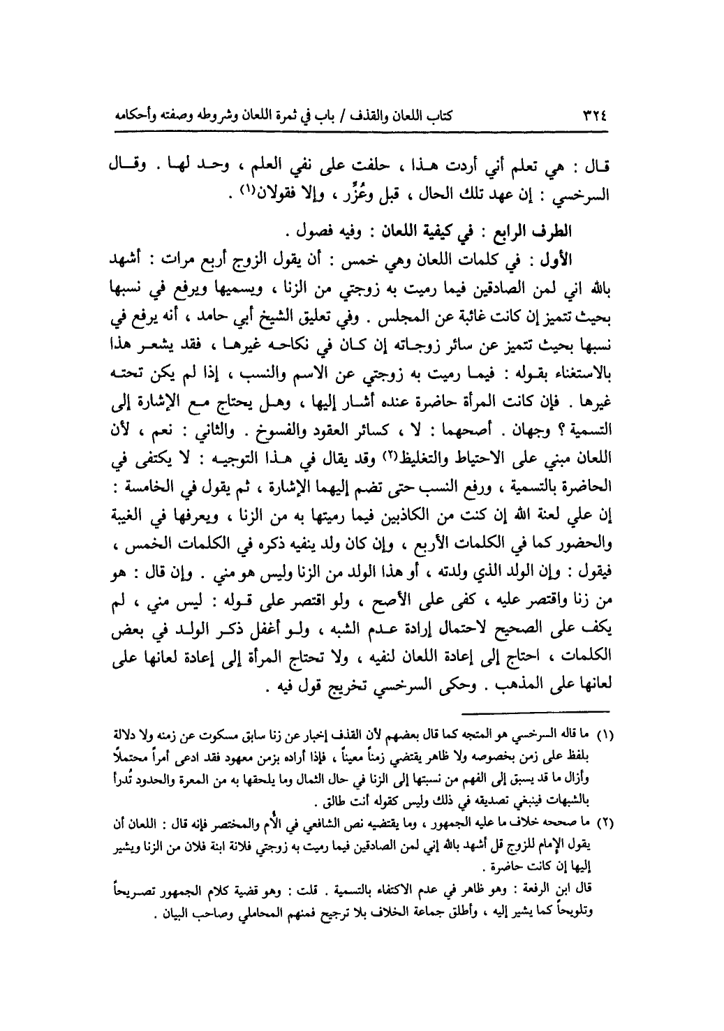 الأول : في كلمات اللعان وهي خمس: أن يقول الزوج أربع مرات: أشهد بالله إني لمن الصادقين فيما رميت به زوجتي من الزنا، ويسميها ويرفع في نسبها بحيث تتميز إن كانت غائبة عن المجلس. وفي تعليق الشيخ أبي حامد، أنه يرفع في نسبها بحيث تتميز عن سائر زوجاته إن كان في نكاحه غيرها، فقد يشعر هذا بالاستغناء بقوله: فيما رميت به زوجتي عن الاسم والنسب، إذا لم يكن تحته غيرها. فإن كانت المرأة حاضرة عنده أشار إليها، وهل يحتاج مع الاشارة إلى التسمية ؟ وجهان. أصحهما: لا، كسائر العقود والفسوخ. والثاني: نعم، لان اللعان مبني على الاحتياط والتغليظ، وقد يقال في هذا التوجيه: لا يكتفي في الحاضرة بالتسمية، ورفع النسب حتى تضم إليهما الاشارة، ثم يقول في الخامسة: إن علي لعنة الله إن كنت من الكاذبين فيما رميتها به من الزنا، ويعرفها في الغيبة والحضور كما في الكلمات الاربع، وإن كان ولد ينفيه ذكره في الكلمات الخمس، فيقول: وإن الولد الذي ولدته، أو هذا الولد من الزنا وليس هو مني. وإن قال: هو من زنا واقتصر عليه، كفى على الاصح، ولو اقتصر على قوله: ليس مني، لم يكف على الصحيح لاحتمال إرادة عدم الشبه، ولو أغفل ذكر الولد في بعض الكلمات، احتاج إلى إعادة اللعان لنفيه، ولا تحتاج المرأة إلى إعادة لعانها على لعانها على المذهب. وحكى السرخسي تخريج قول فيه.
