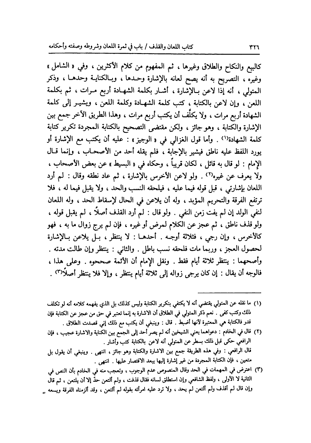 كالبيع والنكاح والطلاق وغيرها، ثم المفهوم من كلام الاكثرين، وفي الشامل وغيره، التصريح به أنه يصح لعانه بالاشارة وحدها، وبالكناية وحدها، وذكر المتولي، أنه إذا لاعن بالاشارة، أشار بكلمة الشهادة أربع مرات، ثم بكلمة اللعن، وإن لاعن بالكتابة، كتب كلمة الشهادة وكلمة اللعن، ويشير إلى كلمة الشهادة أربع مرات، ولا يكلف أن يكتب أربع مرات، وهذا الطريق الآخر جمع بين الاشارة والكتابة، وهو جائز، ولكن مقتضى التصحيح بالكتابة المجردة تكرير كتابة كلمة الشهادة. وأما قول الغزالي في الوجيز: عليه أن يكتب مع الاشارة أو يورد اللفظ عليه ناطق فيشير بالاجابة، فلم يقله أحد من الاصحاب، وإنما قال الامام: لو قال به قائل، لكان قريبا، وحكاه في البسيط عن بعض الاصحاب، ولا يعرف عن غيره. ولو لاعن الاخرس بالاشارة، ثم عاد نطقه وقال: لم أرد اللعان بإشارتي، قبل قوله فيما عليه، فيلحقه النسب والحد، ولا يقبل فيما له، فلا ترتفع الفرقة والتحريم المؤبد، وله أن يلاعن في الحال لاسقاط الحد، وله اللعان لنفي الولد إن لم يفت زمن النفي. ولو قال: لم أرد القذف أصلا، لم يقبل قوله، ولو قذف ناطق، ثم عجز عن الكلام لمرض أو غيره، فإن لم يرج زوال ما به، فهو كالاخرس، وإن رجي، فثلاثة أوجه. أحدها: لا ينتظر، بل يلاعن بالاشارة لحصول العجز، وربما مات فلحقه نسب باطل. والثاني: ينتظر وإن طالت مدته. وأصحهما: ينتظر ثلاثة أيام فقط. ونقل الامام أن الائمة صححوه. وعلى هذا، فالوجه أن يقال: إن كان يرجى زواله إلى ثلاثة أيام ينتظر، وإلا فلا ينتظر أصلا.