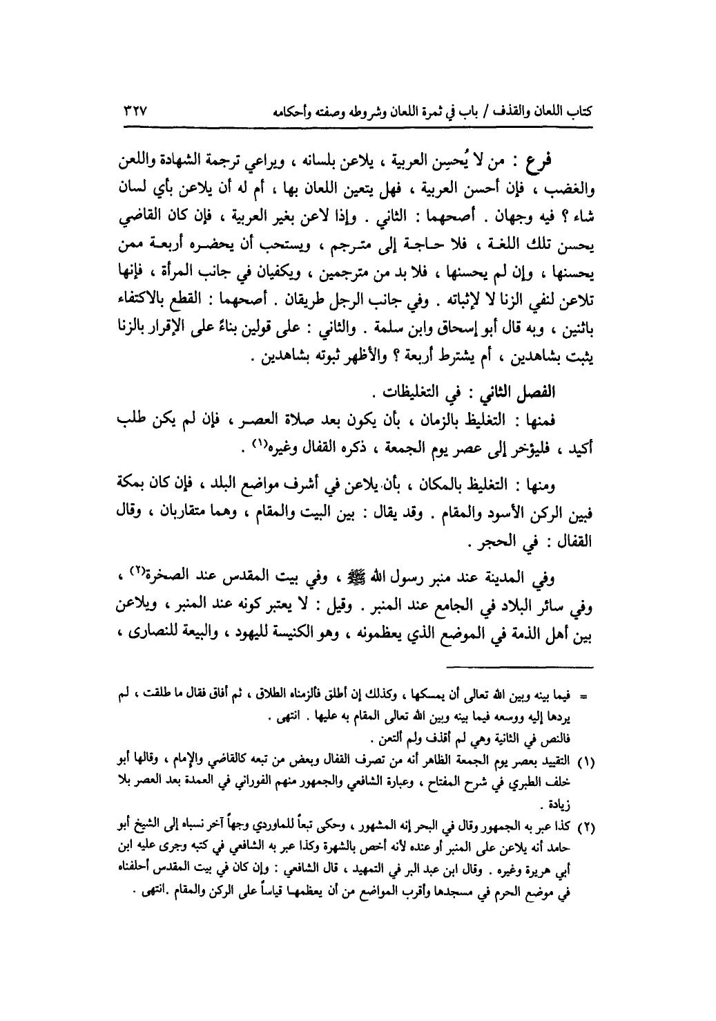 الفصل الثاني : في التغليظات. فمنها: التغليظ بالزمان، بأن يكون بعد صلاة العصر، فإن لم يكن طلب أكيد، فليؤخر إلى عصر يوم الجمعة، ذكره القفال وغيره. ومنها: التغليظ بالمكان، بأن يلاعن في أشرف مواضع البلد، فإن كان بمكة فبين الركن الاسود والمقام. وقد يقال: بين البيت والمقام، وهما متقاربان، وقال القفال: في الحجر. وفي المدينة عند منبر رسول الله - صلى الله عليه وسلم -، وفي بيت المقدس عند الصخرة، وفي سائر البلاد في الجامع عند المنبر. وقيل: لا يعتبر كونه عند المنبر، ويلاعن بين أهل الذمة في الموضع الذي يعظمونه، وهو الكنيسة لليهود، والبيعة للنصارى،