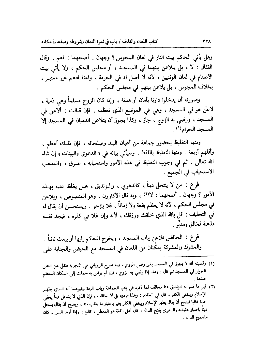 وهل يأتي الحاكم بيت النار في لعان المجوس ؟ وجهان. أصحهما: نعم. وقال القفال: لا، بل يلاعن بينهما في المسجد، أو مجلس الحكم، ولا يأتي بيت الاصنام في لعان الوثنيين، لانه لا أصل له في الحرمة، واعتقادهم غير معتبر، بخلاف المجوس، بل يلاعن بينهم في مجلس الحكم. وصورته أن يدخلوا دارنا بأمان أو هدنة، وإذا كان الزوج مسلما وهي ذمية، لاعن هو في المسجد، وهي في الموضع الذي تعظمه. فإن قالت: ألاعن في المسجد، ورضي به الزوج، جاز، وكذا يجوز أن يتلاعن الذميان في المسجد إلا المسجد الحرام. ومنها التغليظ بحضور جماعة من أعيان البلد وصلحائه، فإن ذلك أعظم، وأقلهم أربعة. ومنها التغليظ باللفظ، وسيأتي بيانه في الدعوى والبينات إن شاء الله تعالى. ثم في وجوب التغليظ في هذه الامور واستحبابه، طرق، والمذهب الاستحباب في الجميع. فرع من لا ينتحل دينا، كالدهري، والزنديق، هل يغلظ عليه بهذه الامور ؟ وجهان. أصحهما: لا، وبه قال الاكثرون، وهو المنصوص، ويلاعن في مجلس الحكم، لانه لا يعظم بقعة ولا زمانا، فلا ينزجر. ويستحسن أن يقال له في التحليف: قل بالله الذي خلقك ورزقك، لانه وإن غلا في كفره، فيجد نفسه مذعنة لخالق ومدبر. فرع الحائض تلاعن بباب المسجد، ويخرج الحاكم إليها أو يبعث نائبا. والمشرك والمشركة يمكنان من اللعان في المسجد مع الحيض والجنابة على