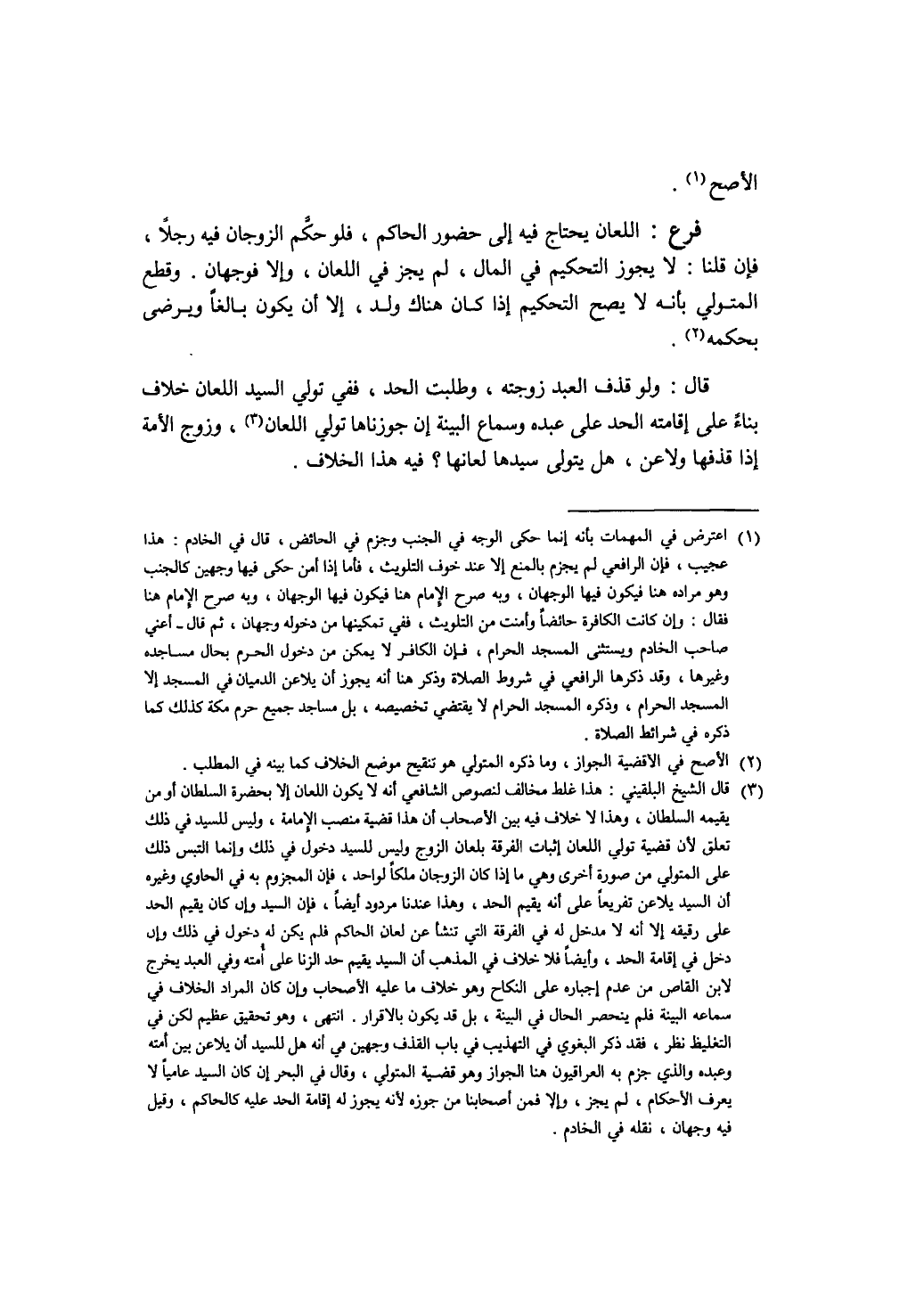 الاصح. فرع اللعان يحتاج فيه إلى حضور الحاكم، فلو حكم الزوجان فيه رجلا، فإن قلنا: لا يجوز التحكيم في المال، لم يجز في اللعان، وإلا فوجهان. وقطع المتولي بأنه لا يصح التحكيم إذا كان هناك ولد، إلا أن يكون بالغا ويرضى بحكمه. قال: ولو قذف العبد زوجته، وطلبت الحد، ففي تولي السيد اللعان خلاف بناء على إقامته الحد على عبده وسماع البينة إن جوزناها تولى اللعان، وزوج الامة إذا قذفها ولاعن، هل يتولى سيدها لعانها ؟ فيه هذا الخلاف.