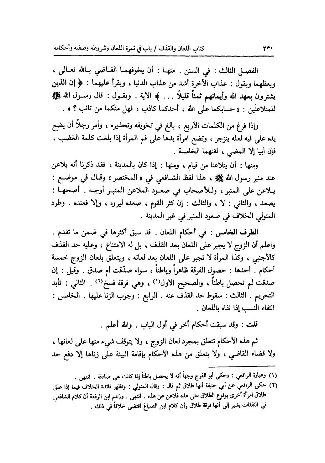الفصل الثالث : في السنن. منها: أن يخوفهما القاضي بالله تعالى، ويعظهما ويقول: عذاب الآخرة أشد من عذاب الدنيا، ويقرأ عليهما: * (إن الذين يشترون بعهد الله وأيمانهم ثمنا قليلا) * الآية. ويقول: قال رسول الله - صلى الله عليه وسلم - للمتلاعنين: حسابكما على الله، أحدكما كاذب، فهل منكما من تائب ؟. وإذا فرغ من الكلمات الاربع، بالغ في تخويفه وتحذيره، وأمر رجلا أن يضع يده على فيه لعله ينزجر، وتضع إمرأة يدها على فم المرأة إذا بلغت كلمة الغضب، فإن أبيا إلا المضي، لقنهما الخامسة. ومنها: أن يتلاعنا من قيام، ومنها: إذا كان بالمدينة، فقد ذكرنا أنه يلاعن عند منبر رسول الله - صلى الله عليه وسلم -، هذا لفظ الشافعي في المختصر وقال في موضع: يلاعن على المنبر، وللاصحاب في صعود الملاعن المنبر أوجه. أصحها: يصعد، والثاني: لا، والثالث: إن كثر القوم، صعده ليروه، وإلا فعنده. وطرد المتولي الخلاف في صعود المنبر في غير المدينة.